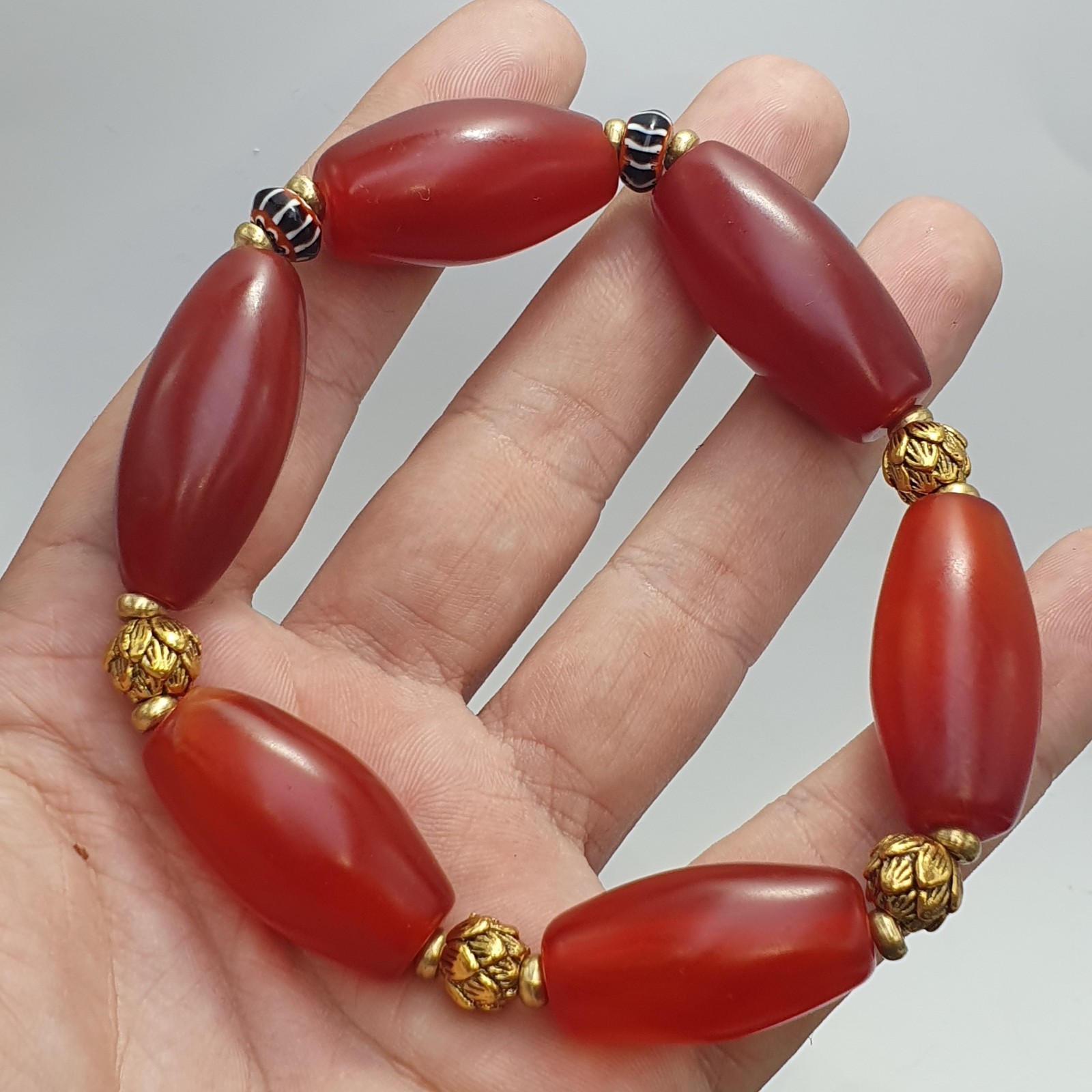 questo bracciale e uno stordimento. quelle perle allungate di agata rossa abbinate a distanziali decorati a righe dorate e dorate gli conferiscono un?eleganza audace e spirituale profondamente radicata nelle tradizioni del design himalayano. Queste perline spesso indicate come agata corniola nelle tradizioni tibetane e nepalesi sono apprezzate non solo per le loro ricche tonalita terrose, ma anche per il loro simbolismo spirituale.