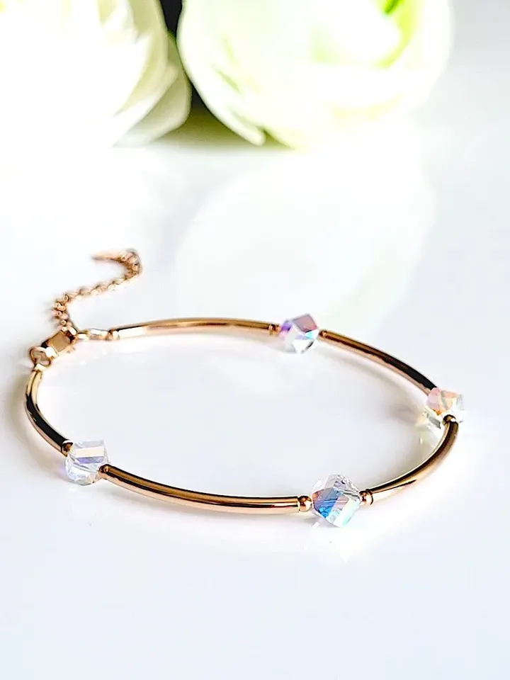 A gold-plated women's bracelet made of 925 sterling silver with 4 Swarovski crystals in the shape of a helix. The crystal size is 6x6 mm. Adjustable size 17 + extension 4 cm. The chain is complemented by a convenient lock with a carabiner, at the end of the chain there is a heart on which there is a sample and a name tag. The silver bracelet is covered with high-quality 585 gold plating in several layers, due to which the product looks identical to gold. Due to the original shape of the crystals, it sparkles with many facets. When creating our jewelry, only premium quality Austrian Swarovski crystals are used. The stones sparkle both in the sun and under artificial light. A gold-plated silver bracelet will perfectly complement any look, is suitable for both everyday wear and an evening out, will go well with red gold jewelry and gold-plated items.