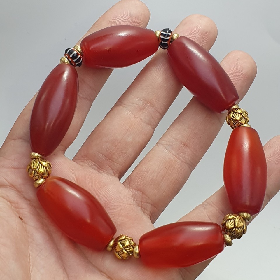 ce bracelet est etonnant. ces perles d?agate rouge allongees associees a des entretoises ornees d?or et rayees lui conferent une elegance spirituelle audacieuse profondement enracinee dans les traditions du design himalayen. Ces perles souvent appelees agate cornaline dans les traditions tibetaines et nepalaises sont prisees non seulement pour leurs teintes riches et terreuses, mais aussi pour leur symbolisme spirituel.