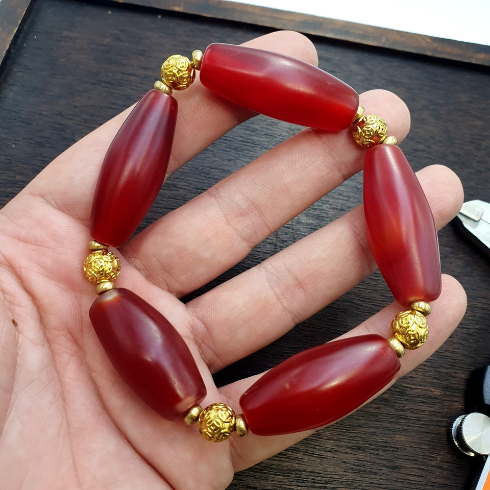 Ce bracelet est etonnant. ces perles d?agate rouge allongees associees a des entretoises ornees d?or et rayees lui conferent une elegance spirituelle audacieuse profondement enracinee dans les traditions du design himalayen. Ces perles souvent appelees agate cornaline dans les traditions tibetaines et nepalaises sont prisees non seulement pour leurs teintes riches et terreuses, mais aussi pour leur symbolisme spirituel.