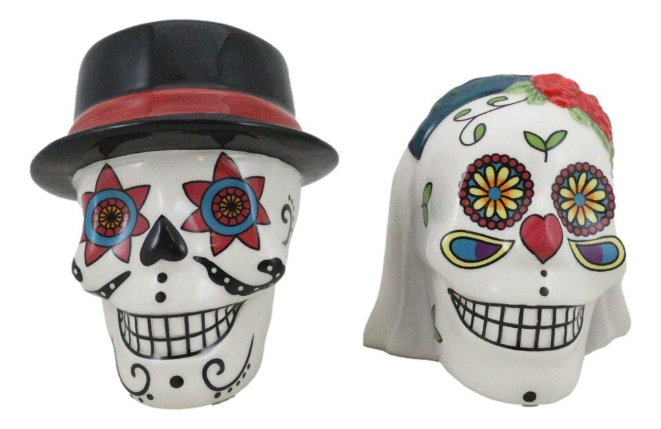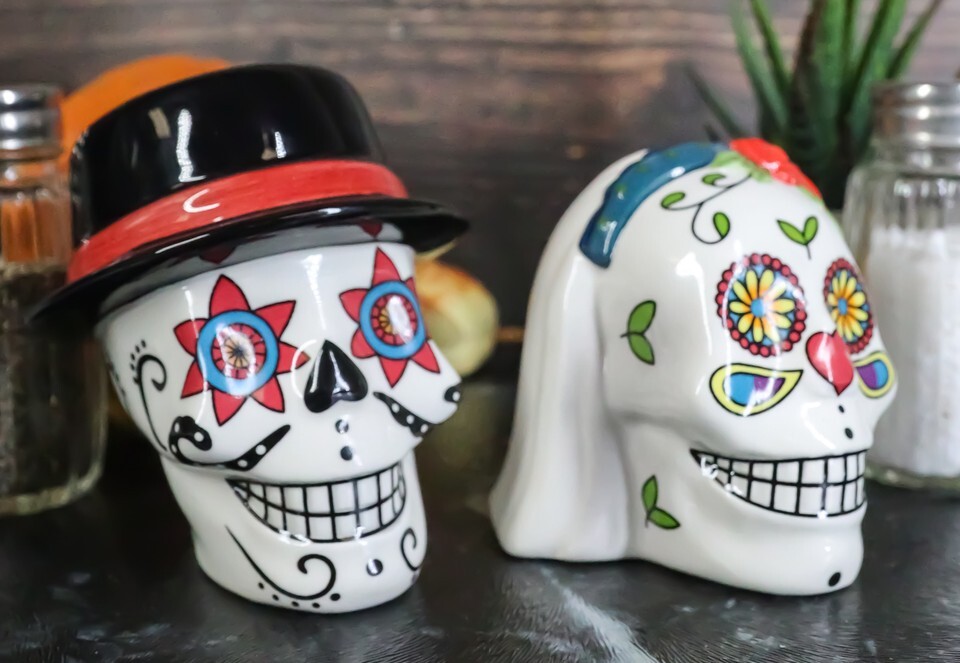 ? Now you can complete your Day of the Dead sugar skull collection with this beautiful set of sugar skulls salt and pepper shakers. Each ceramic shaker is hand painted with a colorful and detailed Mexican folk art design typical of a traditional Day of the Dead or Dia de los Muertos sugar skulls. The main theme in this set is bridal by nature, featuring a bride and groom on their sugar skull wedding day.