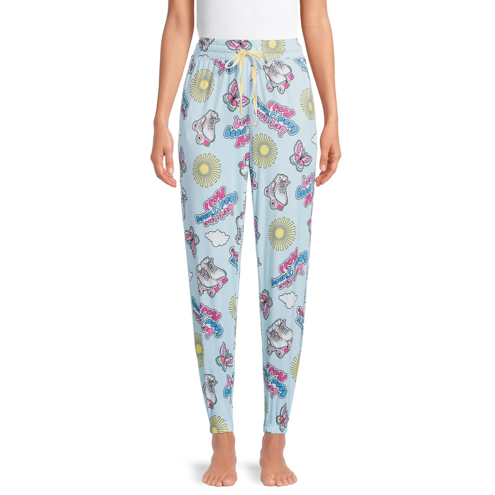 Briefly Stated Women's Roller Skate Sleep Jogger Pants, Aqua Reef Size 3X(22W-24W) Let the good times roll with these 60's-inspired Sleep Joggers. A comfy way to settle in for the night or kick back and relax all day. Pair them with a tee or tank and you're on your way to dreamville. Material: 60% Cotton/40% Polyester Care: Machine washable Fit: Slim with a tapered leg Rise: Mid-rise Closure: Pull-on styling; elastic waistband with drawstring tie Pockets: None Features: Allover print; elasticized cuffs Women's Roller Skate Sleep Jogger Pants