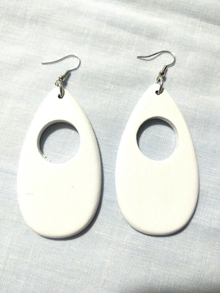 - BRIGHT WHITE TEARDROP SHAPE HAND PAINTED REAL WOOD DANGLING FASHION EARRINGS