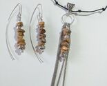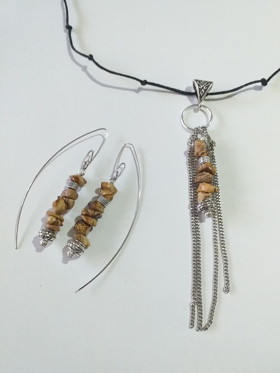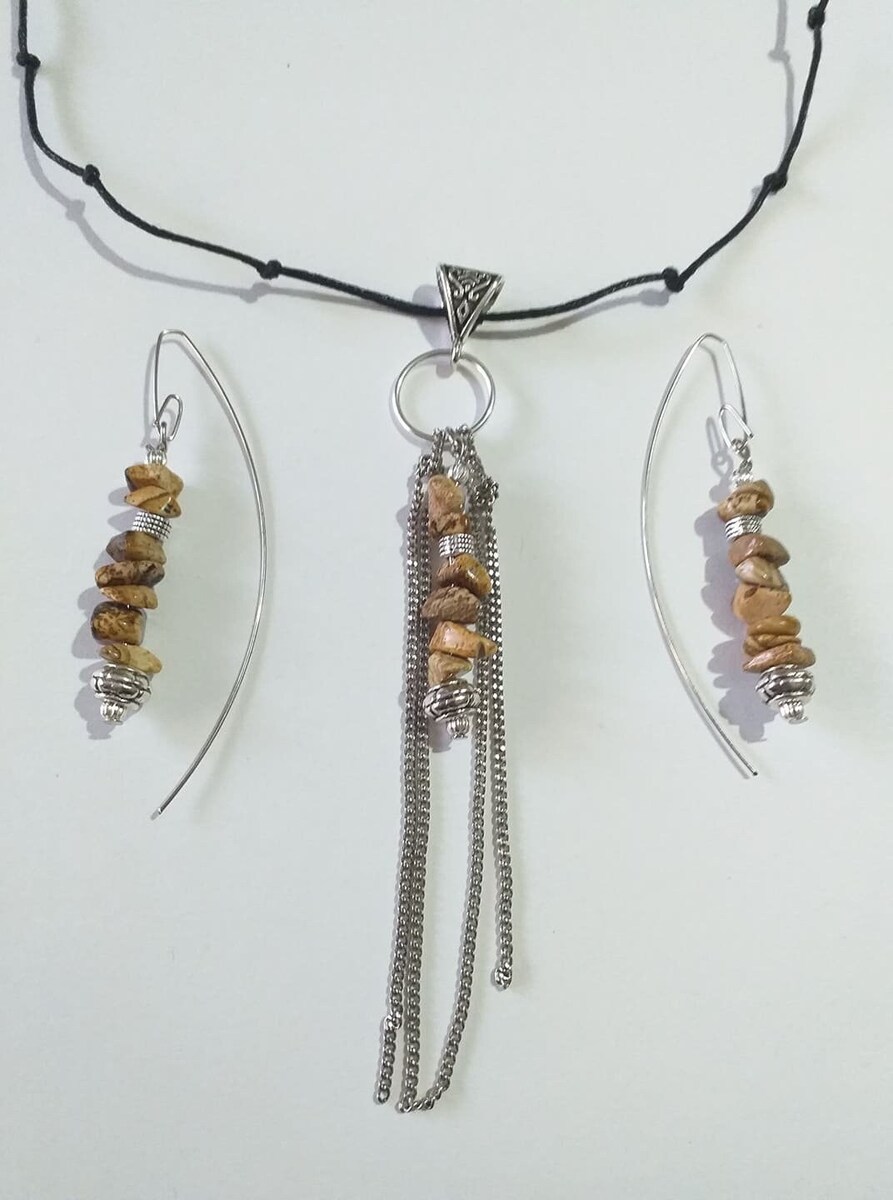 Beautiful silver-tone Antique style brown Jasper set necklace with black cotton cord chain free on the back to tie it and wire boho earrings . Silver-tone set earrings and pendant necklace . Bohemian style earrings and necklace . Boho earrings and necklace. Romantic jewelry set earrings and necklace. Beautiful earrings and necklace with natural shape Jasper gemstone .
