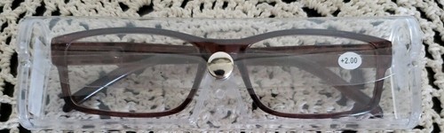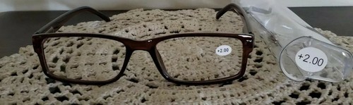 This sale is for one (1) pair of reading glasses for presbyopia Presbyopia is a natural phenomenon linked to aging of the eyes which diminishes the vision from age 40-45 on-wards +2.00 LENSES R999-200 These glasses are Dark Brown in color Rectangular Shaped Framed Glasses Unisex, universal model of glasses Comes with a clear plastic case for storage Glasses are high-quality, lightweight, comfortable reading glasses with flexible hinges which adapt to all face shapes sizes Please view photos for a good description of these glasses Thank you!