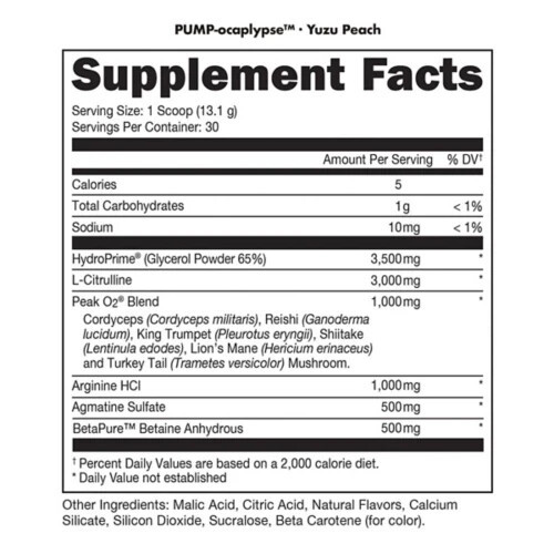 BUCKED UP PUMP-OCALYPSE YUZU PEACH 13.8 OZ 30 SERVINGS 04/2026 HYDRO PRIME PEAK O2 BLEND CITRULLINE ARGININE BETAINE ANHYDROUS ZERO SUGAR KETO/PALEO FRIENDLY CAFFEINE FREE BRAND NEW