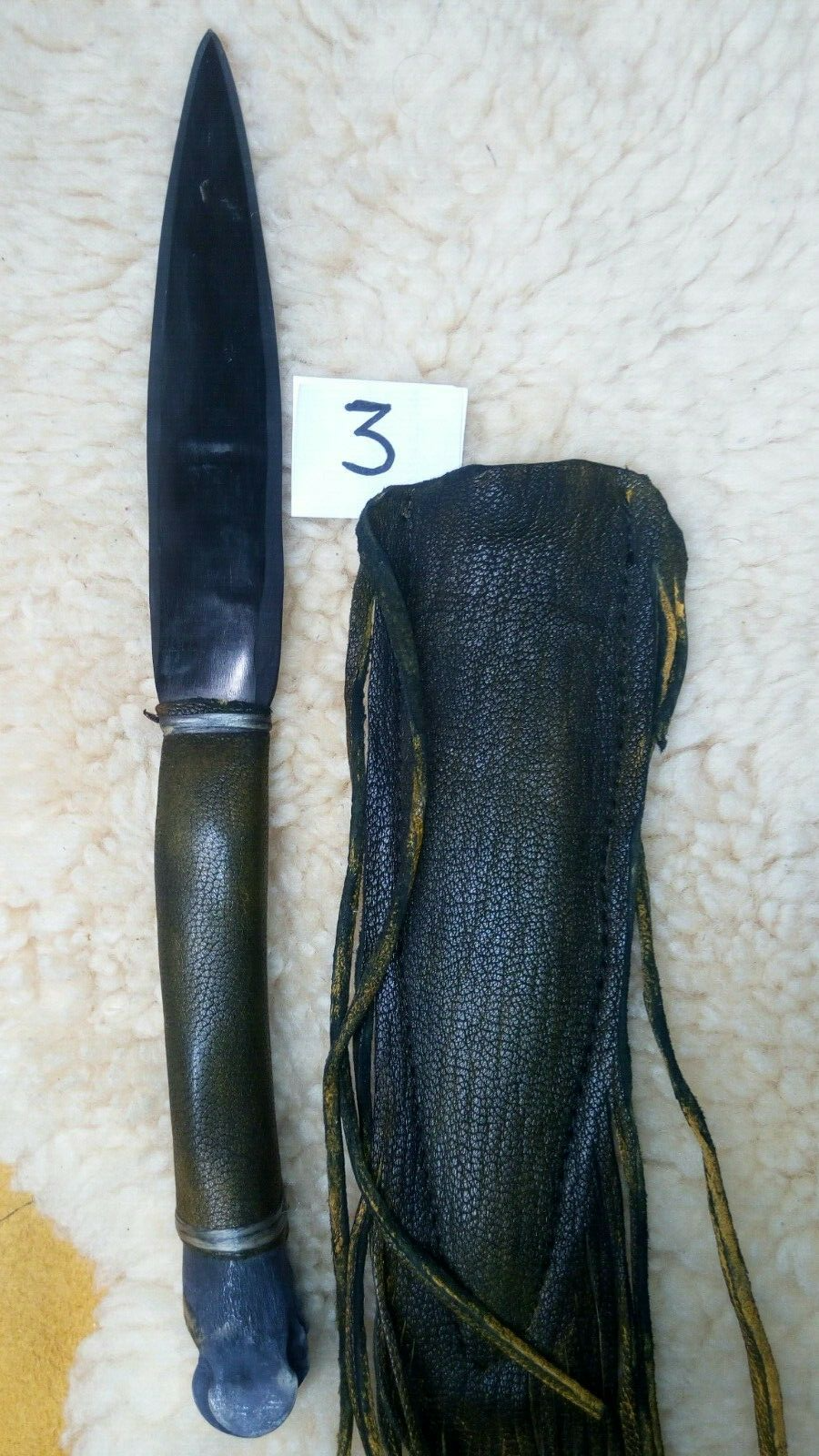 Buffalo horn knife blade, Deer Leg handle, dyed dark green deer hand stitched buckskin leather wrapped in imitation sinew, a dark green buckskin. Knife. with sheath made of latigo and deer buckskin, machine stitched. 13 inches long. Powwow Reenactment Black Powder. Condition is "New". Shipped with USPS First Class.