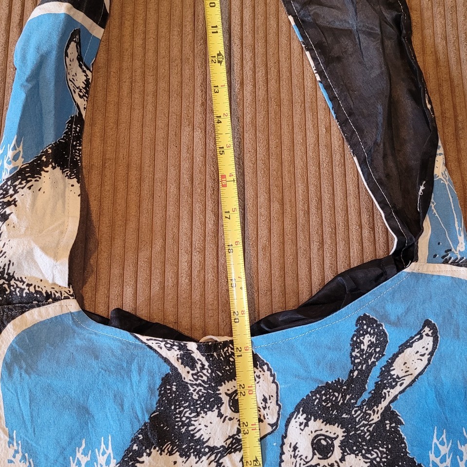 Closes with a button and inside is secured with a zipper. The bag has plenty of interior space and a side pocket to stash your keys and phone