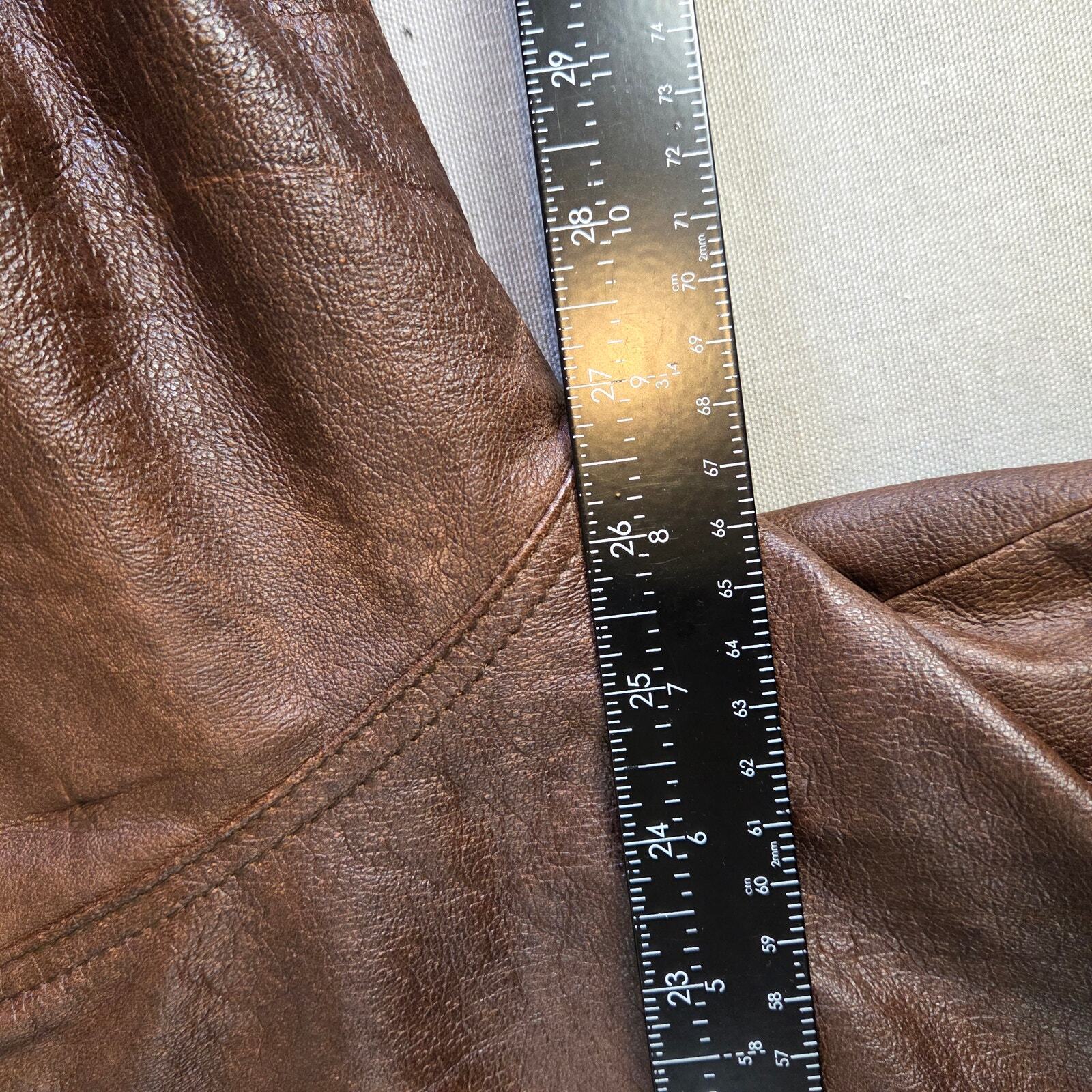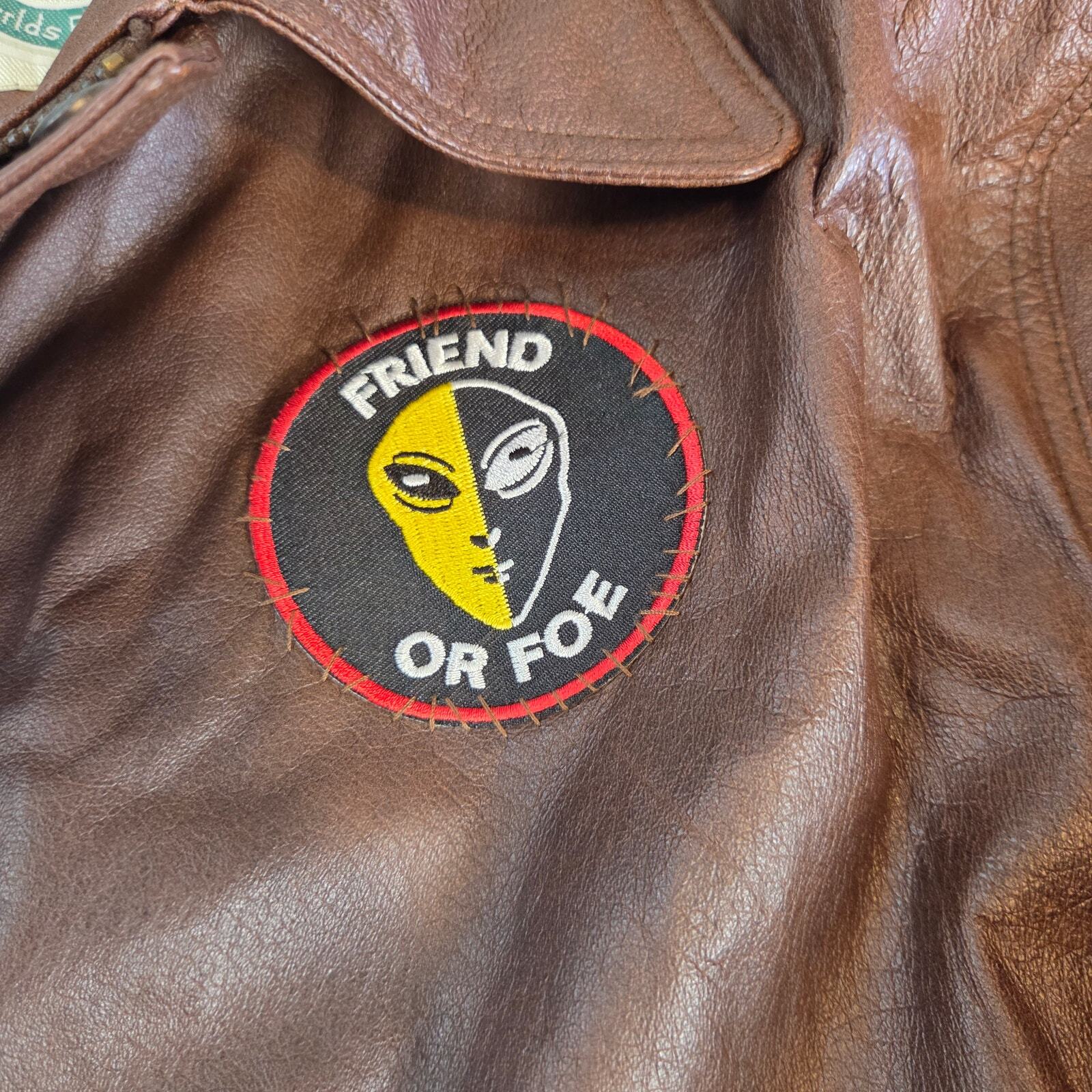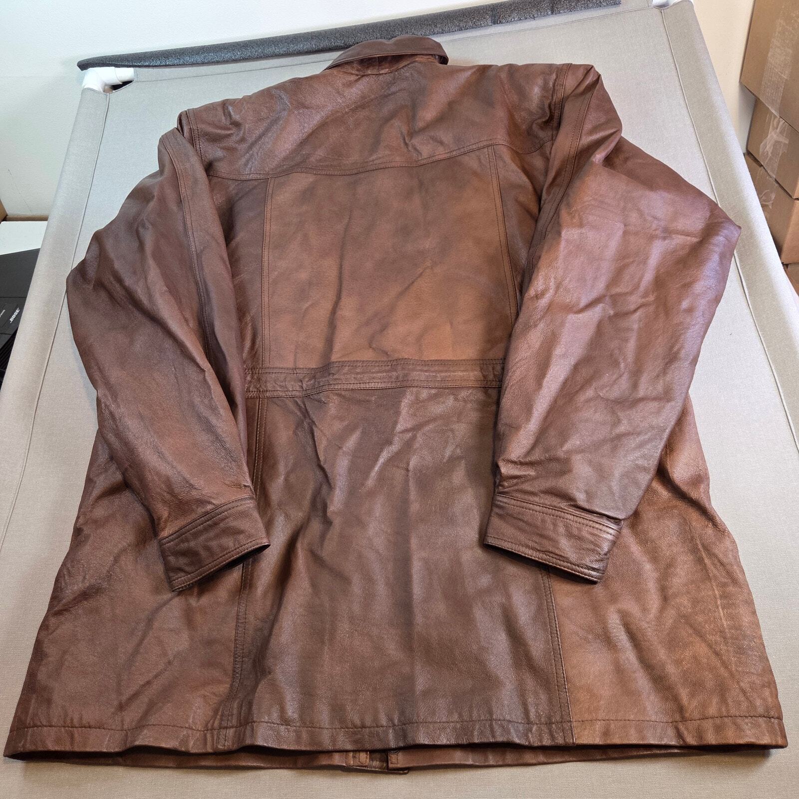 Classic Burk?s Bay genuine leather car coat in men?s size 2XT Tall. This jacket features a brown leather shell, plaid lining at the upper body, and large front flap pockets. It has an aftermarket sewn-on ?Friend or Foe? alien patch on the chest, adding a unique touch. The jacket shows light wear consistent with age but remains in solid condition overall. Burk?s Bay genuine leather car coat jacket Men?s size 2XT Tall Plaid flannel upper lining with nylon lower body lining Large flap pockets and snap cuffs Aftermarket sewn-on ?Friend or Foe? alien patch Shell: 100% genuine leather; Lining: nylon; Insulation: polyester
