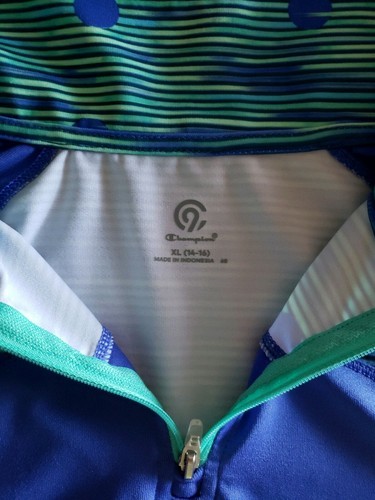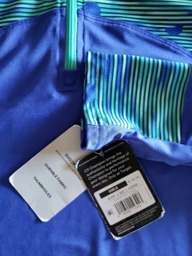 This sale is for one (1) C9 Champion brand pullover top Girl's Size Extra Large-XL (14-16) Measures approximately 17" armpit to armpit Measures approximately 23" from back collar seam to front hem Long sleeve pullover with thumbholes on cuff Blue with a multi-colored stripe design Quarter (1/4) zipper closure D9004 Duo dry ~ wicks moisture ~ dries fast Durable fabric Thumbholes 90% Polyester ~ 10% Spandex Machine Wash ~ Tumble Dry This top is brand new with tags Please view photos for a good description of this item Thank you!