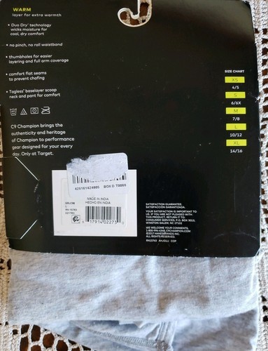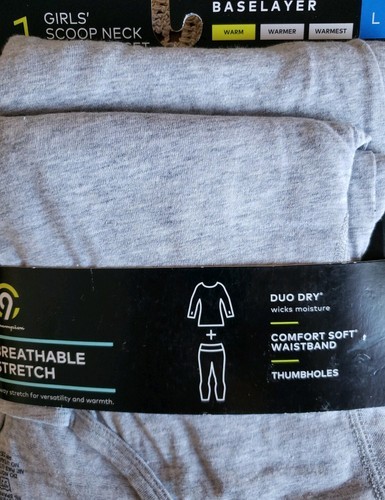 This sale is for one (1) C9 Champion brand baselayer Girl's Size Large (L) ~ 10/12 Two (2) piece set ~ Tagless baselayer scoop neck top with matching pants Gray in Color Duo Dry ~ wicks moisture No pinch ~ No roll waistband Comfort flat seam Thumbholdes for easier layering full arm coverage 58% Cotton ~ 37% Polyester ~ 5% Spandex Machine wash ~ Tumble dry This set is brand new with tags ~ outside packaging is not in perfect condition Please view photos for a good description of this item Thank you!