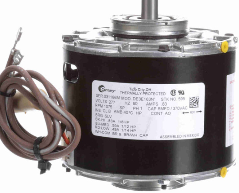 The Century 595 (DE3E163N, 031186M) Fan Coil Air Conditioning Motor is a high-quality PSC (Permanent Split Capacitor) motor designed for fan coil and air conditioning systems that require quiet, efficient, and reliable operation. Rated at 1/8 HP and 1075 RPM, this single-phase, 277V motor features three speeds, reversible rotation, and a 42 Frame (5" diameter) design for easy installation and optimal airflow performance. Built with automatic thermal protection, sleeve bearings, and resilient ring mounting, it provides smooth, dependable service in continuous-duty air-over applications.
