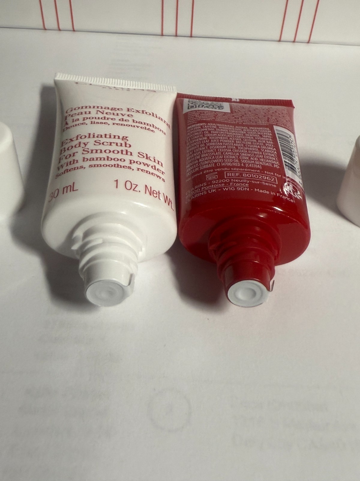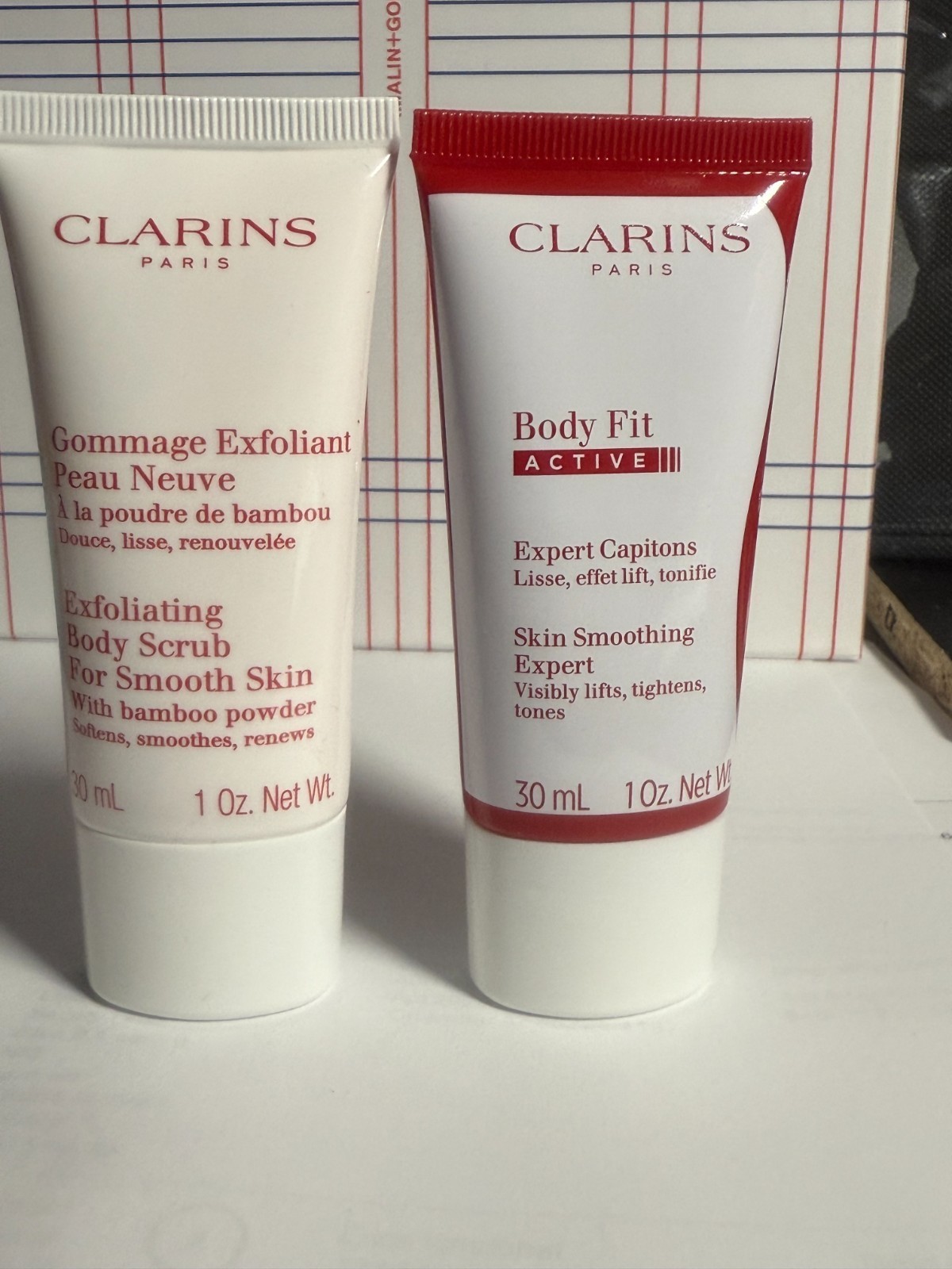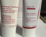 NEW SEALED TUBES CLARINS BODY FIT Skin Smoothing Expert, Visibly Lifts and Tightens and EXFOLIATING BODY SCRUB with Bamboo Powder, SIZE: 1 OZ / 30mL EACH