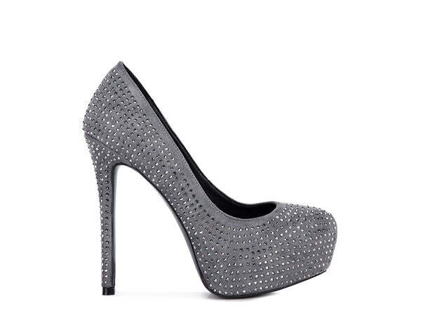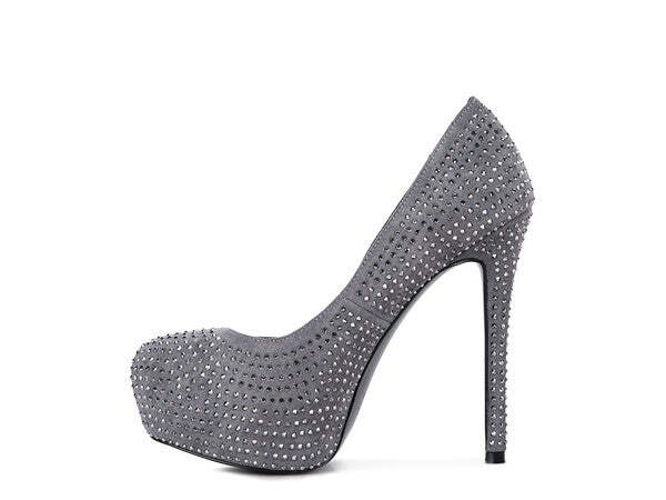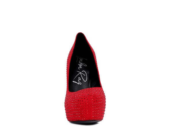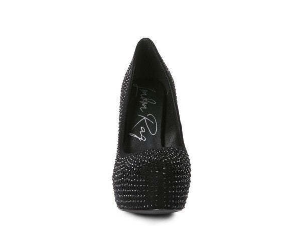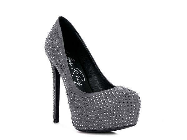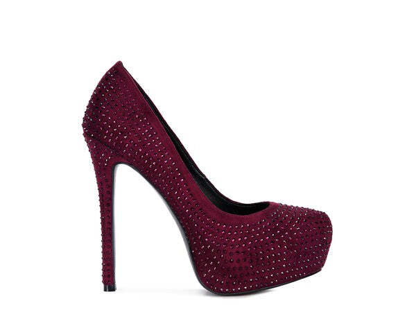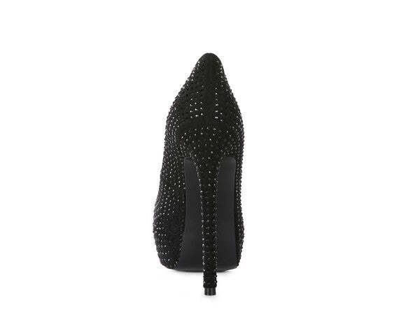 High Heeled Dress Sandal with diamante heat set in microfiber. The stiletto pumps with the raised platform are a stylish pick. The heat set diamante detail looks gorgeous on feet.