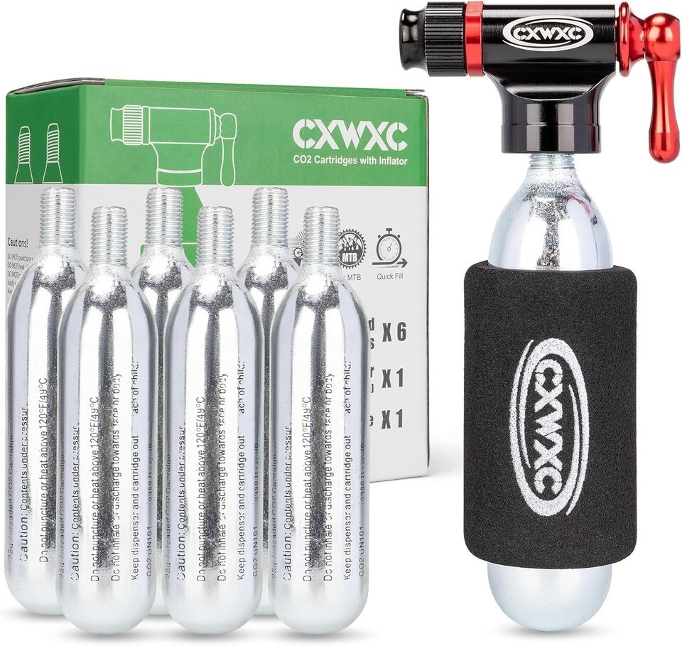 Set includes 4 CO2 cartridges (16g), a CO2 inflator, and an insulating sleeve.