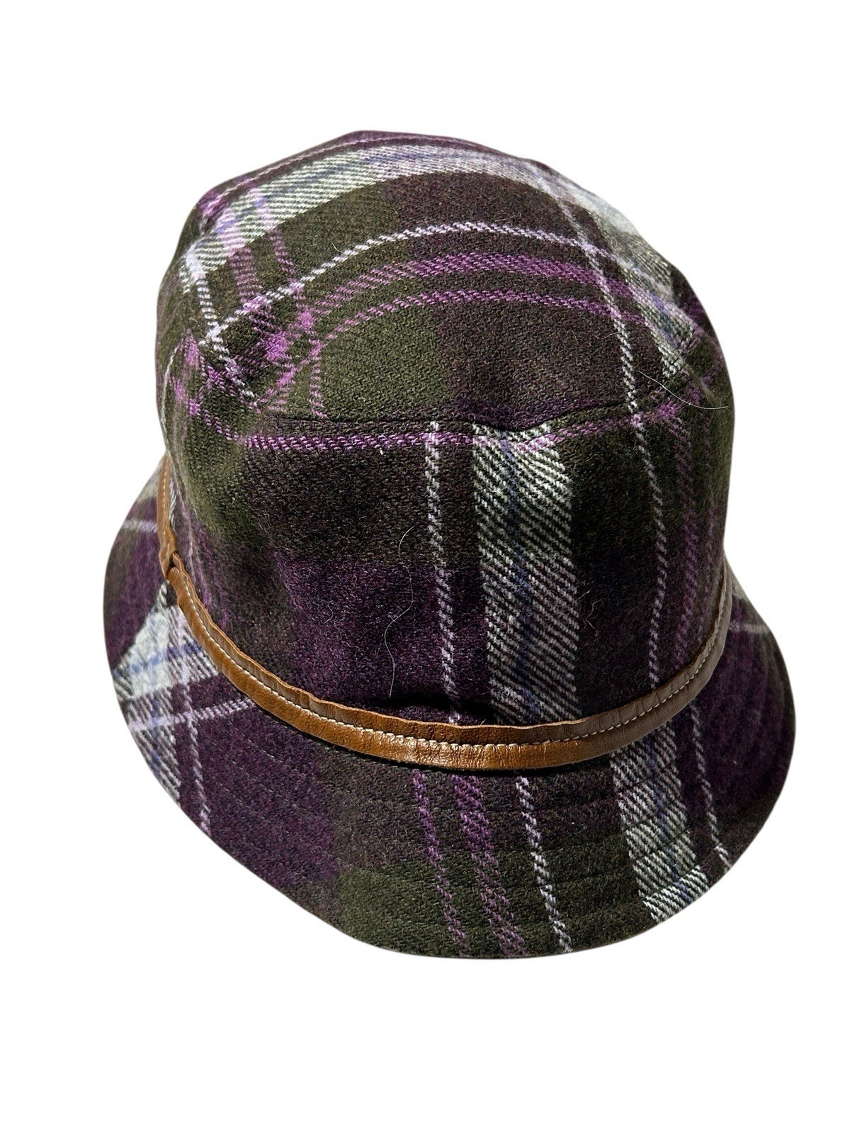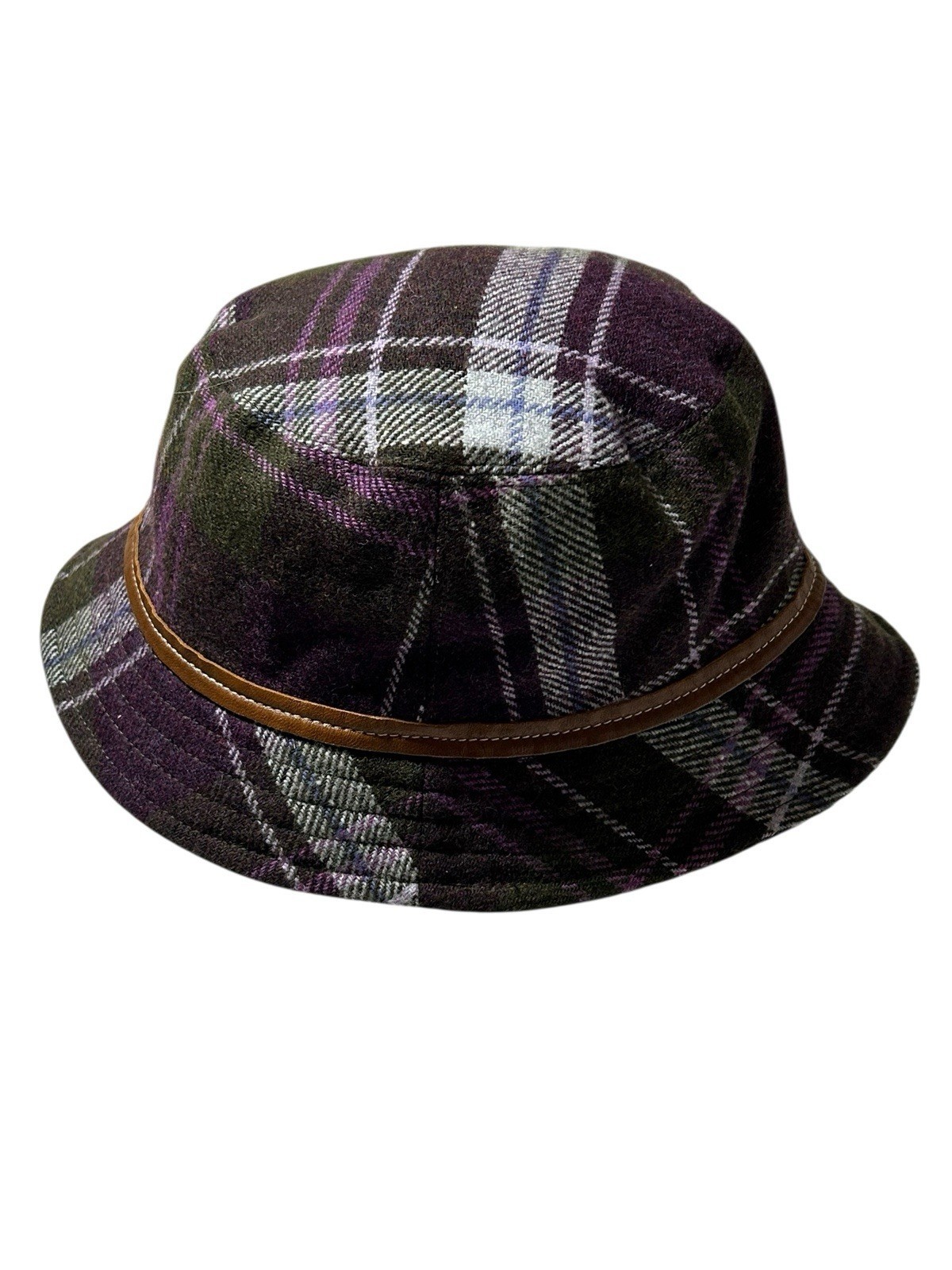 The COACH 80% Wool 20% Nylon Plaid Bucket Hat in P/S petite, small is a stylish accessory perfect for travel, casual outings, or workwear. Made from wool tartan fabric, this purple hat features leather trim accents, giving it a classic, boho, or preppy look. Ideal for the winter and fall seasons, this bucket hat is a versatile piece that can elevate any outfit with its timeless Coach Leatherworks design.