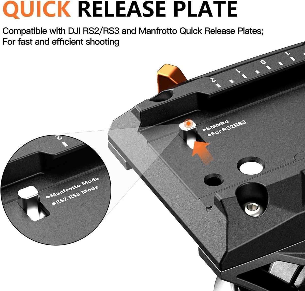 ?Upgrade Quick Installation System?Compared with the traditional slide-in structure, press the QR plate directly from the top of the head and lock it within 1 second,or you can quick locking and releasing of the pull bolt the QR plate via the side,convenient to switch between tripod and gimbal shooting,for photographers quickly place the camera.Equipped with foldable panels, more possibilities for angle locking to switch between horizontal and vertical lenses.With L-shaped hexagonal key, the camera can be fixed without the need for additional tools