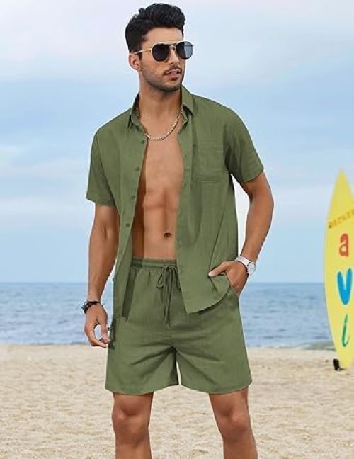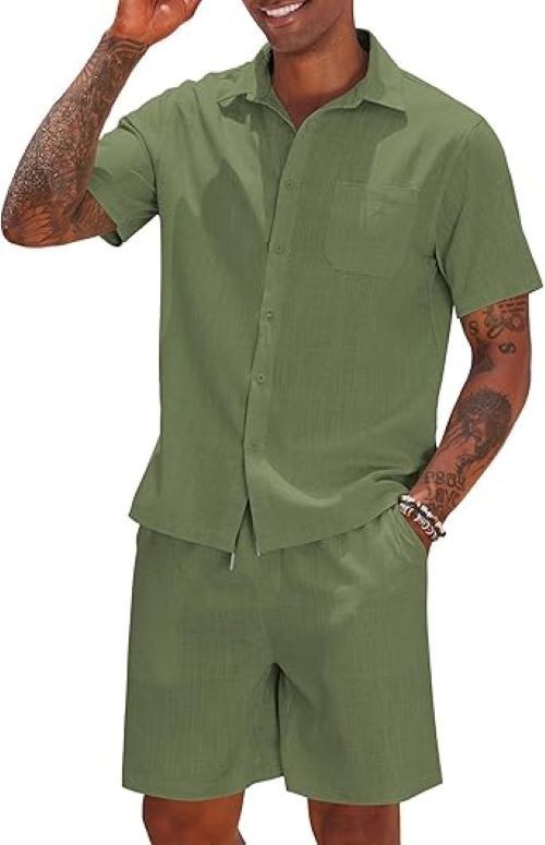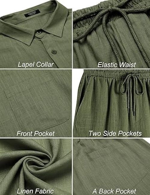 - COOFANDY Men 2 Piece Linen Set Casual Short Sleeve Shirt and Short Beach Set L