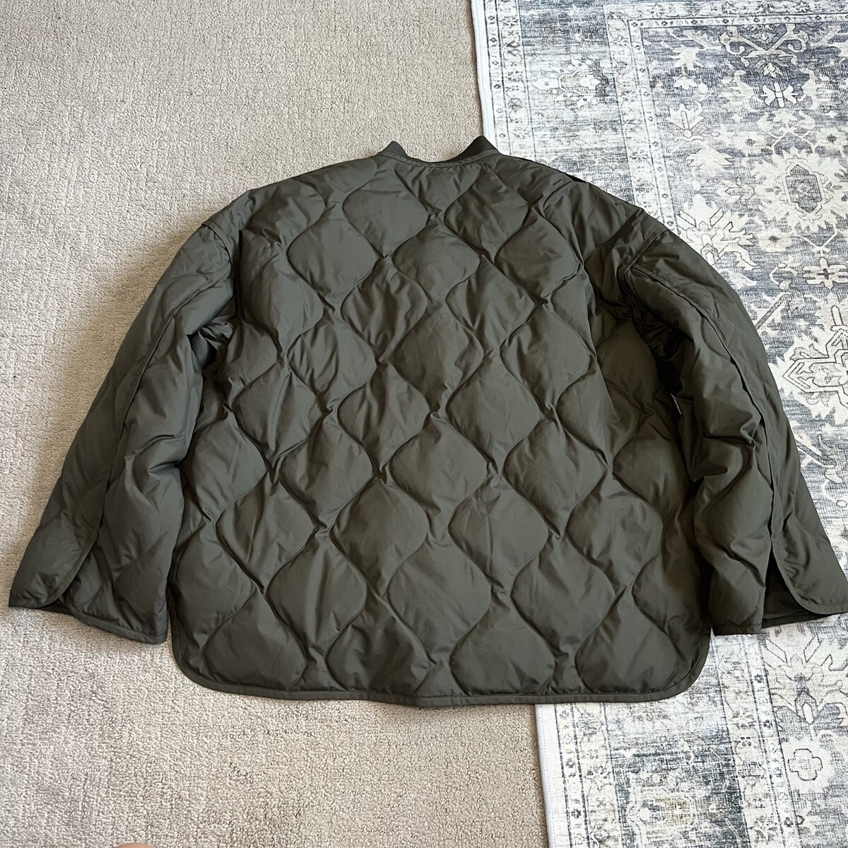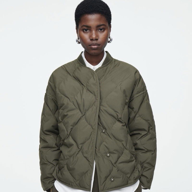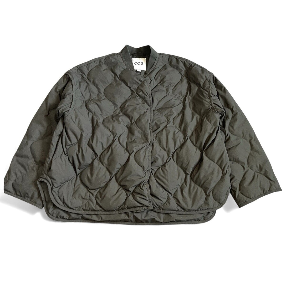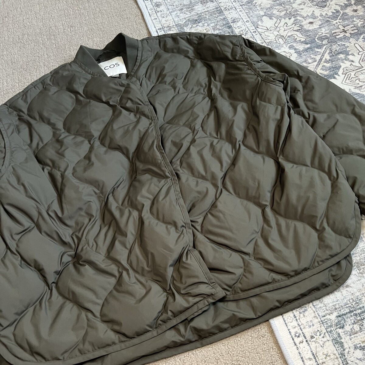COS Women?s Oversized Quilted Down Puffer Jacket Sz L Olive Green $229 EUC Excellent use condition, minimal wear. Please use zoom function to see complete details DESCRIPTION Designed for the cooler months, this modern jacket is filled with a recycled down and feather padding that's diamond-quilted for even heat distribution. It's cut in an oversized shape and has a ribbed collar, a number of pockets and a stepped hem at the back. The dark-khaki hue will style effortlessly with the rest of your wardrobe. Oversized fit Snap-stud closure, internal patch pocket A better alternative to conventional polyester, recycled polyester is made from pre? and post?consumer waste Shell Lining: 100% Recycled polyester. Padding: 80% Recycled down, 20% Recycled feather. Excluding trims / Machine wash