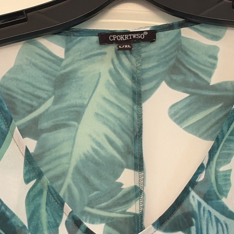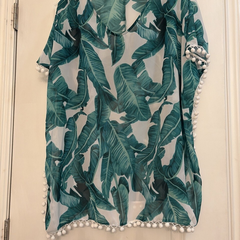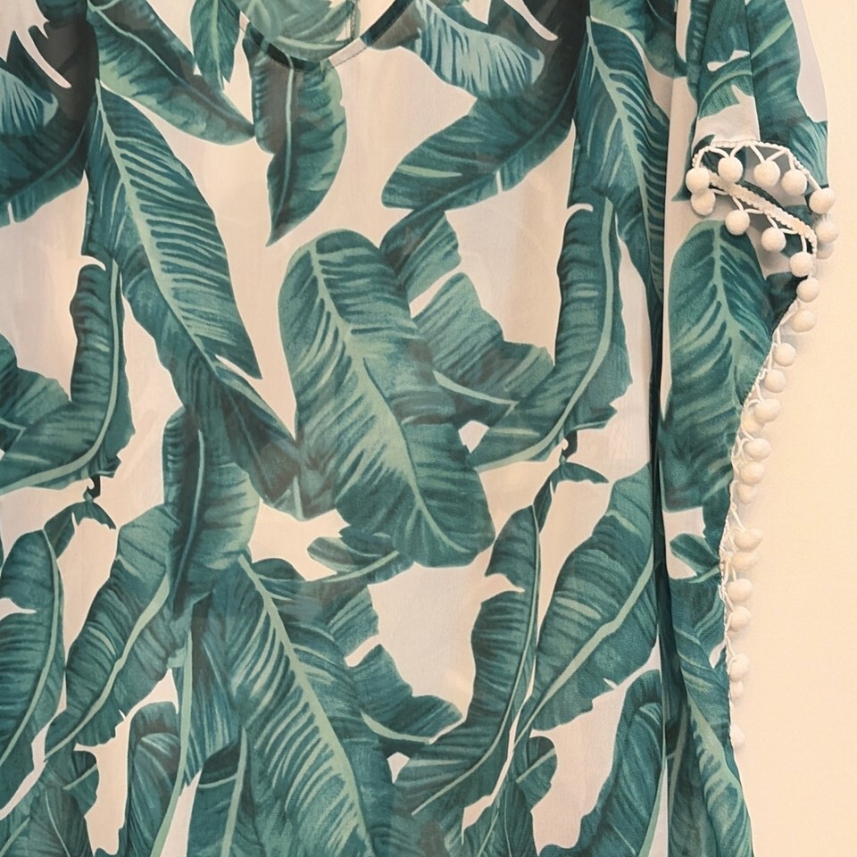 - CPOKRTWSO Women's Tropical Leaf Chiffon Swimsuit Cover Up Pom Pom Trim L/XL