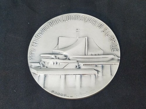 In vendita c'e una sterlina Medaglia Cattolica CAART per il Primo Centenario Della Glorificazione Di S. Gabriele in custodia blu. La parte anteriore della medaglia raffigura un uomo con una rosa, mentre la parte posteriore mostra la chiesa. La medaglia pesa 3,5 once.