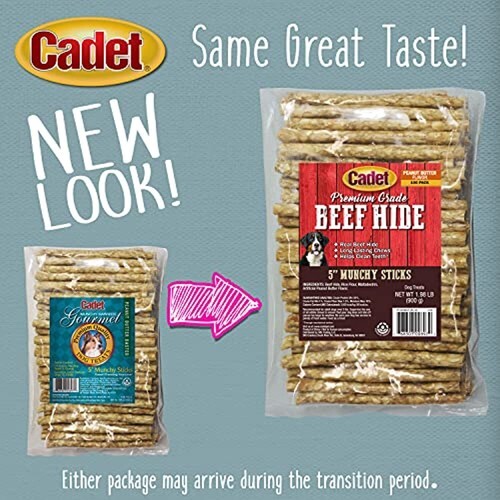 For over 30 years, Cadet has been providing naturally delicious chews and treats to satisfy every dogs' primal urge to chew. Cadet Beef Hide Munchy Beef Hide Sticks are premium-grade rawhide chews made with 100% real beef hide from the finest quality cattle for the naturally delicious taste dogs crave. These rawhide sticks are also basted with savory flavor and help clean teeth and gums as dogs chew. Treat your dog to Munchy Sticks to keep them busy and happy!
