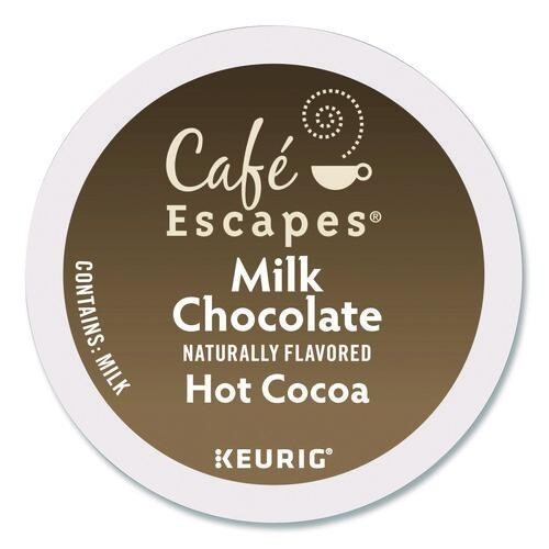 Selling old stock comes in a generic box 60 ct Enjoy a delicious dessert treat in beverage form with these hot cocoa pods. The milk chocolate and cocoa combine to create a sweet, satisfying flavor profile, and the simple pod format offers easy preparation with no milk to boil. These Keurig K-Cup Cafe Escapes hot cocoa pods come in a 72-count package, providing an ample supply to serve your staff and office visitors. K-Cup pods of cocoa powder for Keurig brewers Box contains 60 individual 0.52 oz. pods Cocoa powder with milk chocolate Contains milk; caffeine content is estimated at less than 10mg per serving