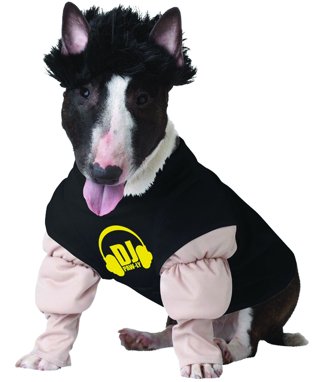 Get your pet to bark out a fresh beat! Muscle chest shirt and wig. 100% polyester. Fits xsmall size pet 8 long.