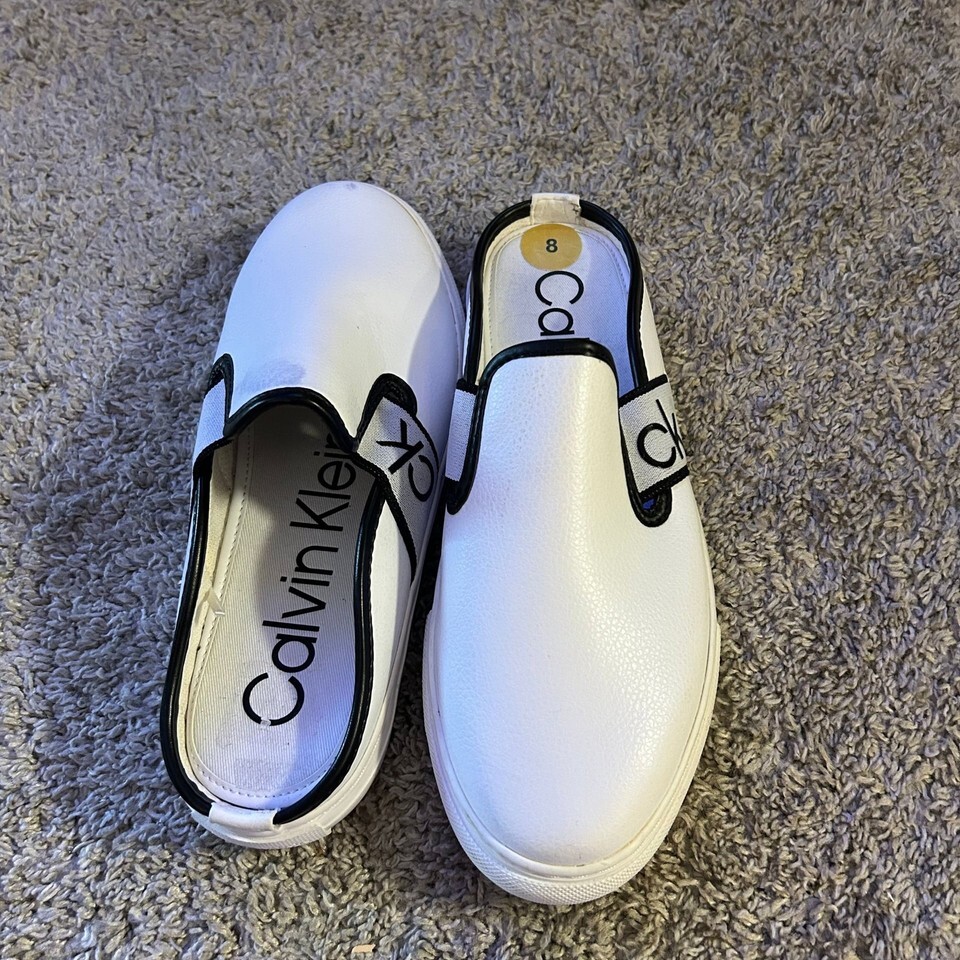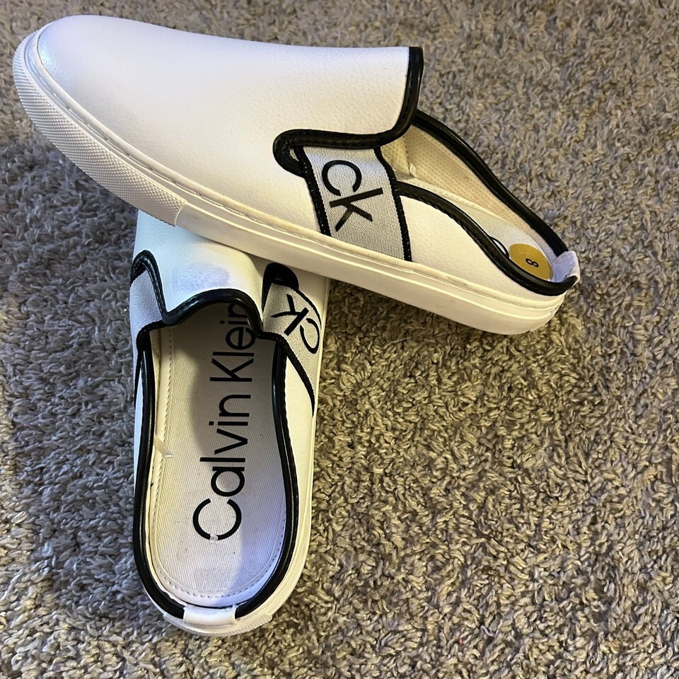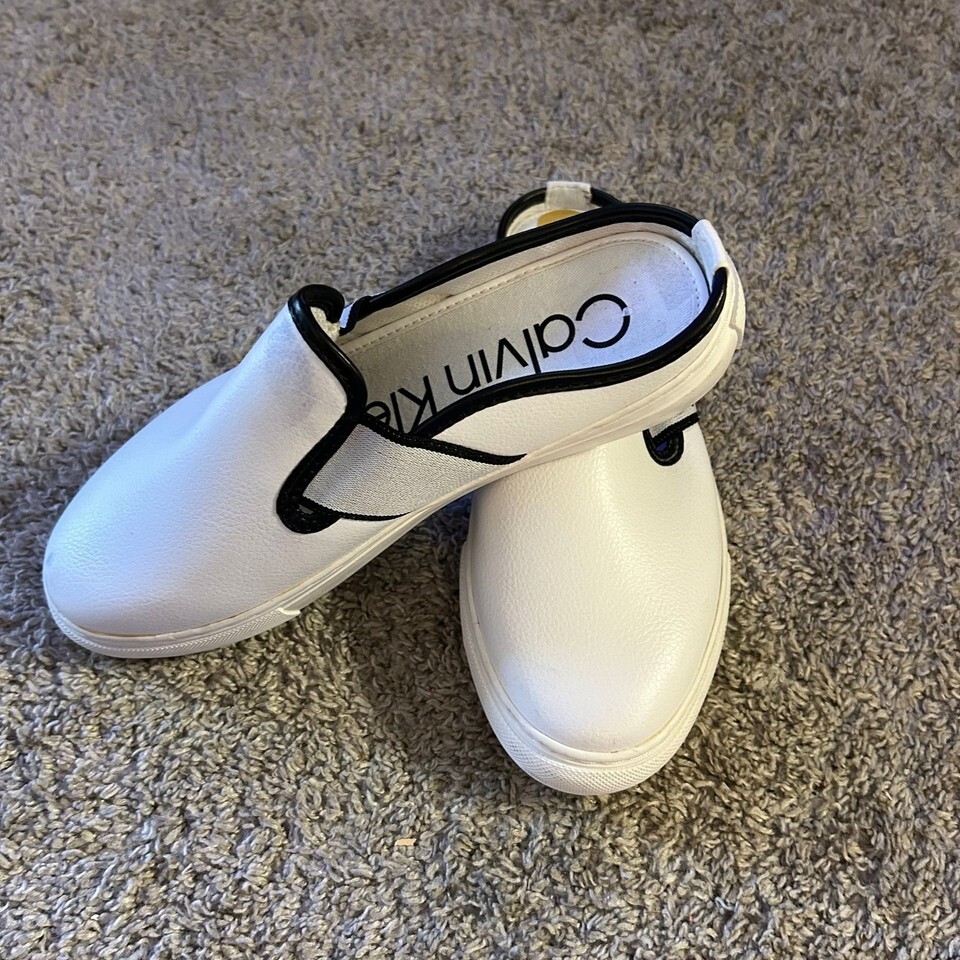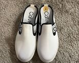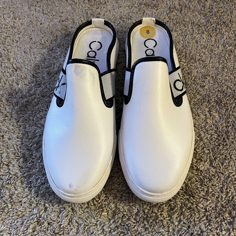 Calvin Klein Women's Lena Embossed Slip-On Sneaker Mules in white faux leather size 8. These white slip-on sneakers feature classic Calvin Klein branding on the side, offering a casual yet stylish look. Perfect for everyday wear, providing comfort and ease. Excellent pre-owned condition, with minimal signs of wear as shown in the images. Ryor is a sought-after style for its versatility and design.