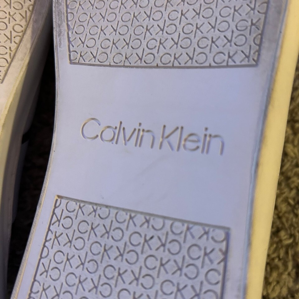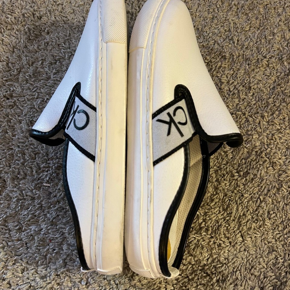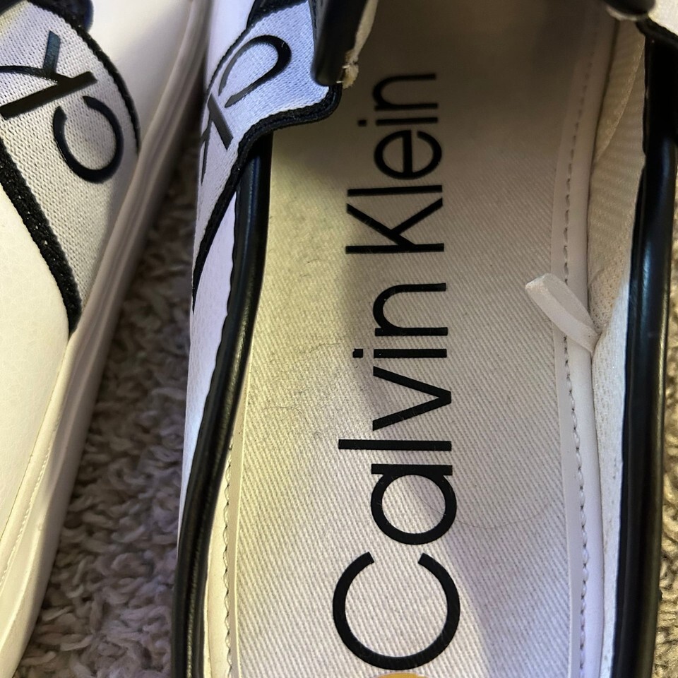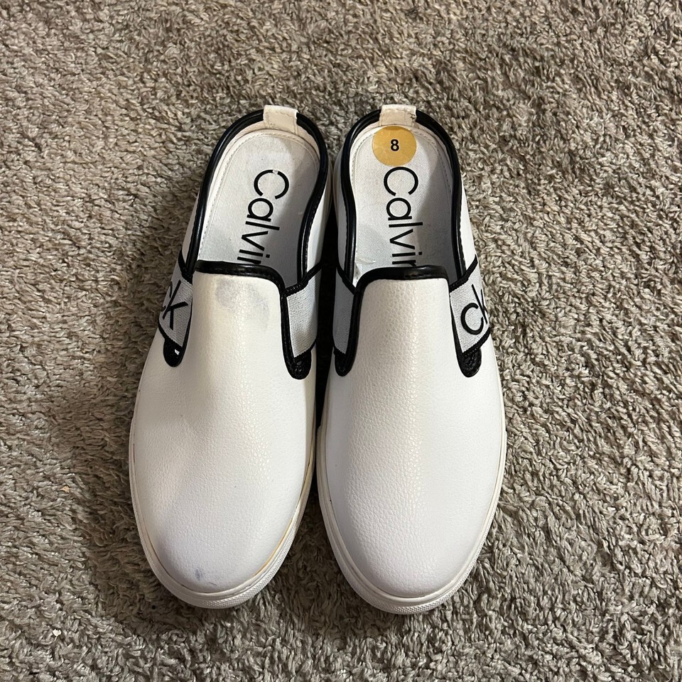 Calvin Klein Women's Lena Embossed Slip-On Sneaker Mules in white faux leather size 8. These white slip-on sneakers feature classic Calvin Klein branding on the side, offering a casual yet stylish look. Perfect for everyday wear, providing comfort and ease. Excellent pre-owned condition, with minimal signs of wear as shown in the images. Ryor is a sought-after style for its versatility and design.