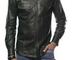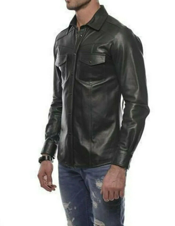 Camicia da uomo in vera pelle di agnello elegante nera fatta a mano alla moda...
