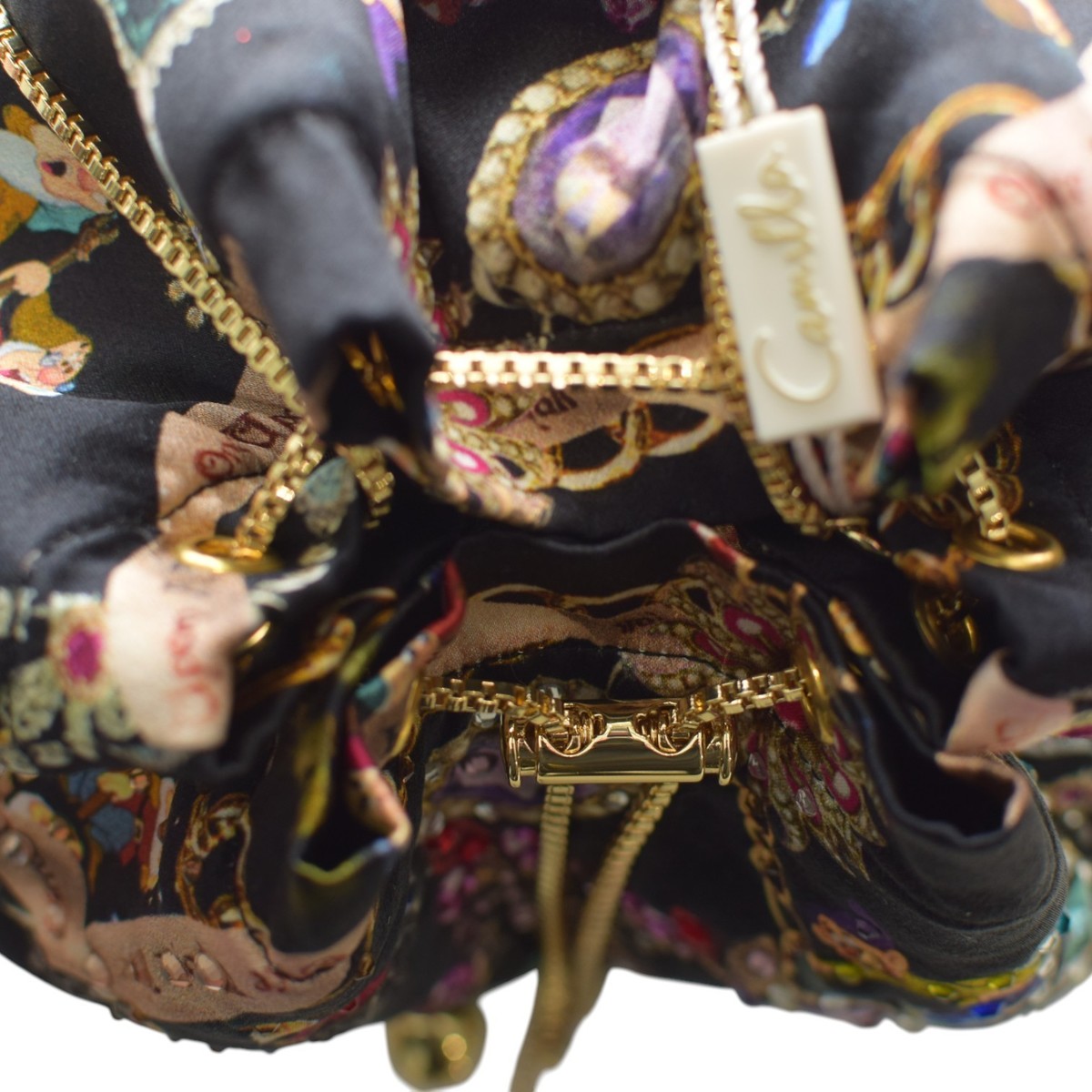 Dazzle at any event with this exquisite Camilla evening bag, crafted from luxurious silk and adorned with the brand?s signature ornate jeweled print. The Happily Ever After Drawstring Pouch With Chain Strap is inspired by fairytale scenes entwined with ribbons and ?Magic Mirror? messages. Elevate your evening attire with this Disney | CAMILLA luxury pouch bag with a petite silhouette and metallic drawstring fastening closure to secure your treasured essentials. The gold shoulder chain exudes chic versatility and finishes of custom gold apple and heart locket tassels give this evening bag unique allure. Featuring a vibrant mix of gemstone motifs in rich colors, this pouch-style bag captures Camilla?s signature bohemian glamour and attention to detail.