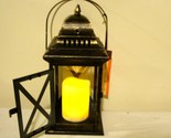 Here is a new led candle lantern, I Have on Sale at a great price, this is made of metal and has a neat design, it is a brushed black over an Antique brassy finish and has plexiglass sides around it and a door on front with latch so can open or can keep closed, inside is attached led pillar candle and has 5 hour timer, this is battery operated and i am including batteries , battery compartment is on bottom as i show in 1 picture, this has attached metal handle that folds up and down also,this measures 14 inch high to top of handle when it is up and 13 inch high to top of lantern, and is 5 1/2 inch wide,this is a medium size lantern and would accent any room of a home nicely, and can use outdoors in an enclosed area.