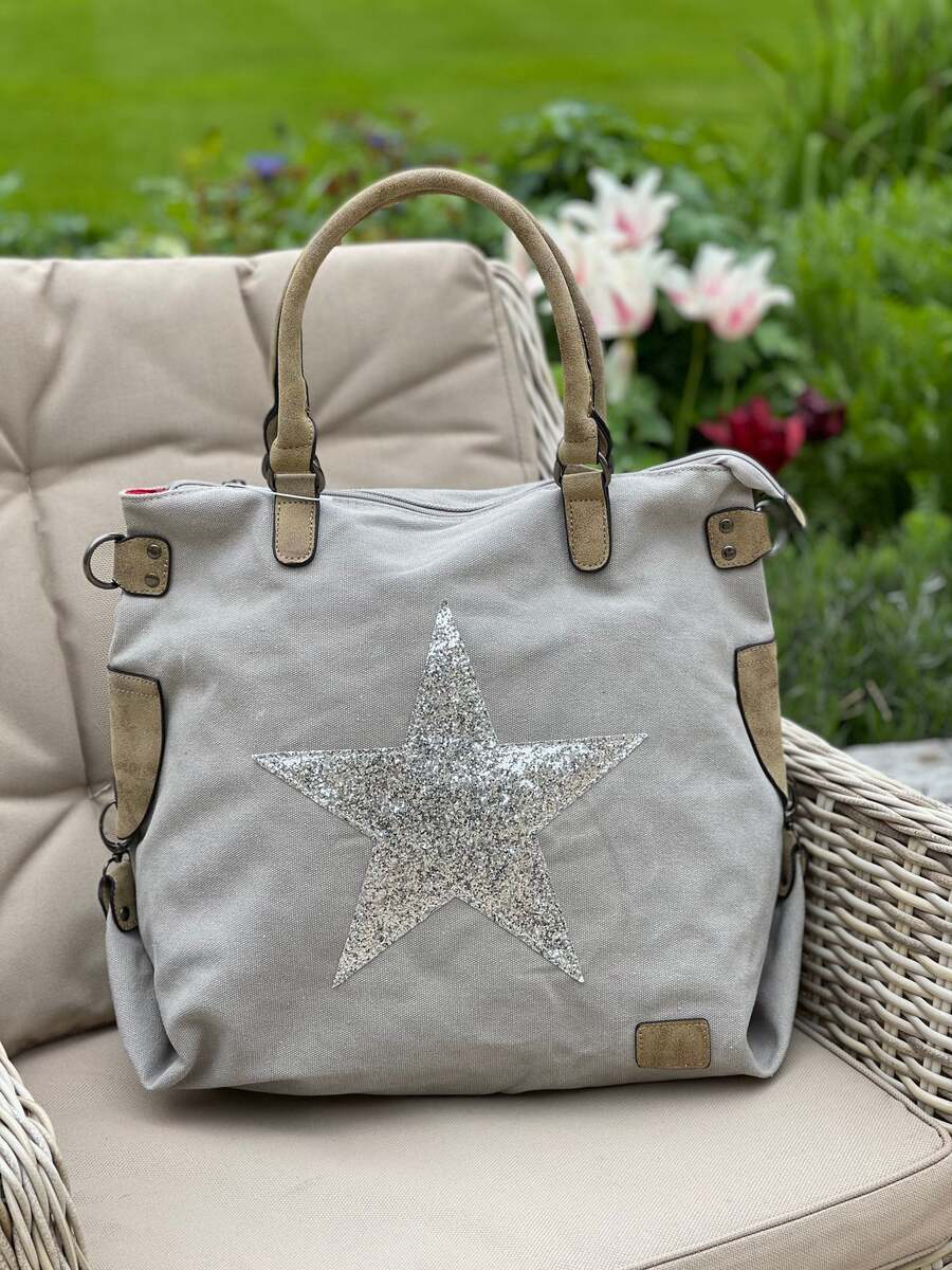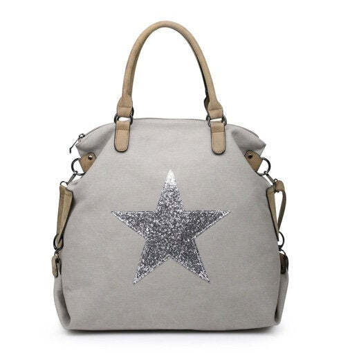 Stunning light grey canvas tote bag featuring a glam sparkly star. Oversized bag so great for days out, beach shopping