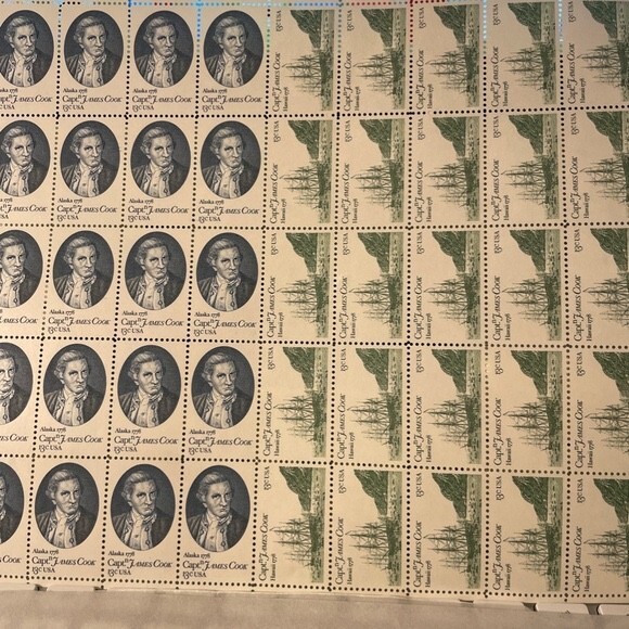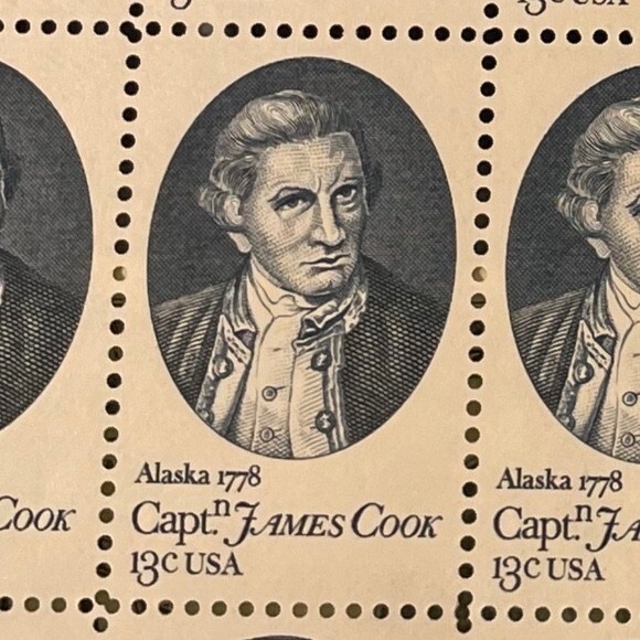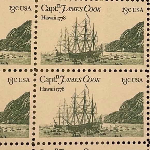 The product is a block of 10 unused 13c US featuring Captain James Cook's voyage to Hawaii and Alaska in 1778. Each likely depicts a scene or event from this historical adventure, making it a unique and Americana-themed collectible item. Made of paper and produced in the theme of adventure time, would be a valuable addition to any art collection focused on American historical moments