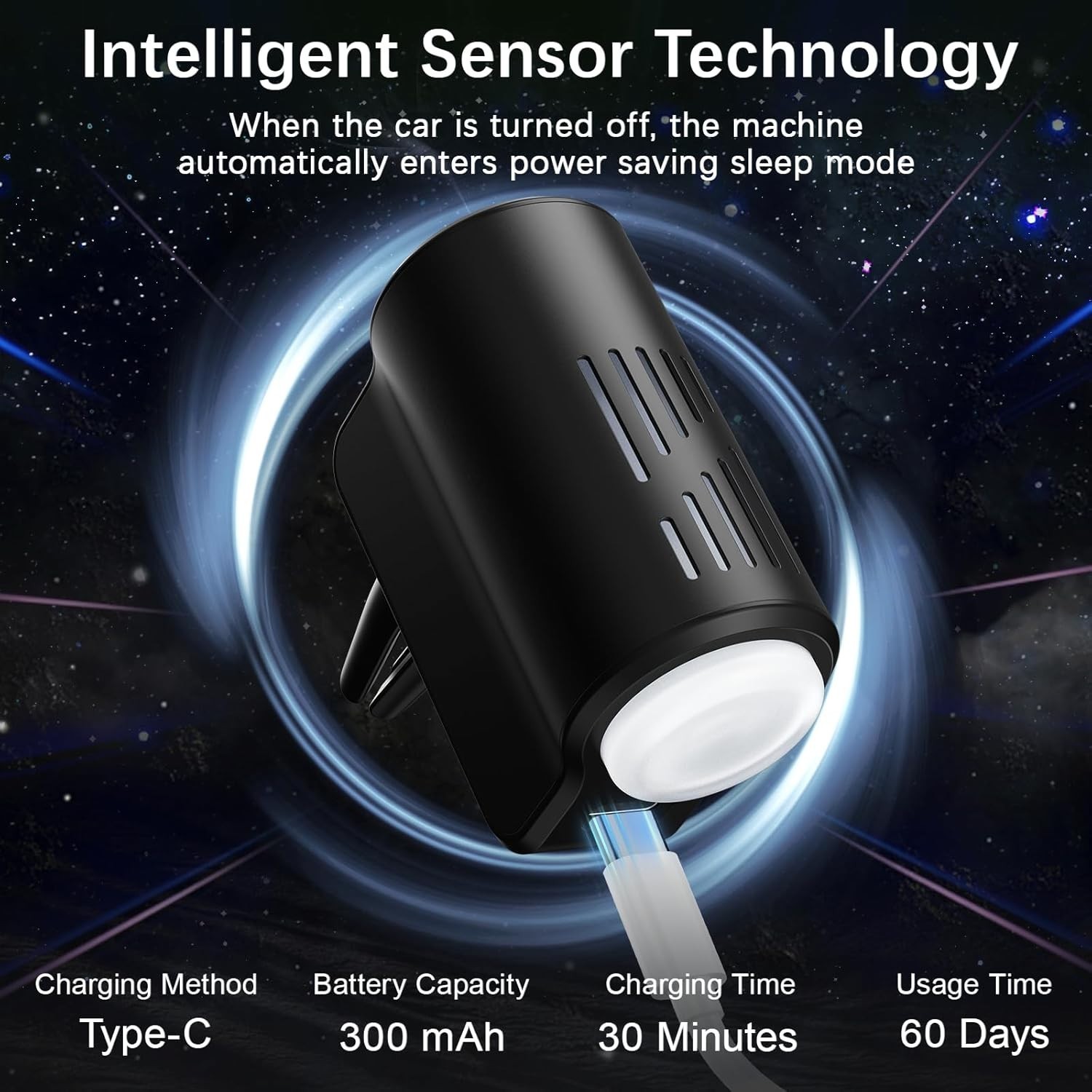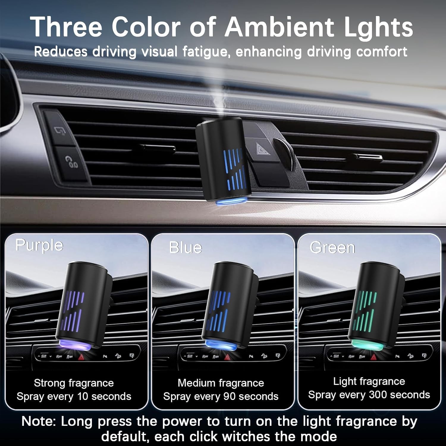 : The aromatizante para carro offers three modes with adjustable spray intervals to meet different fragrance needs; purple light for a strong fragrance, spraying for 0.2 seconds every 10 seconds; blue light for a medium fragrance, spraying for 0.2 seconds every 90 seconds; green light for a fresh fragrance, spraying for 0.2 seconds every 300 seconds