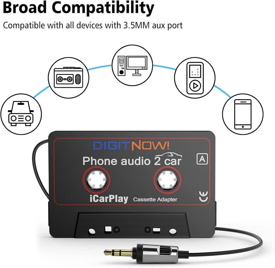 Works with tape players, smartphones, iPods, iPhones, tablets, MP3 players, and car stereos.