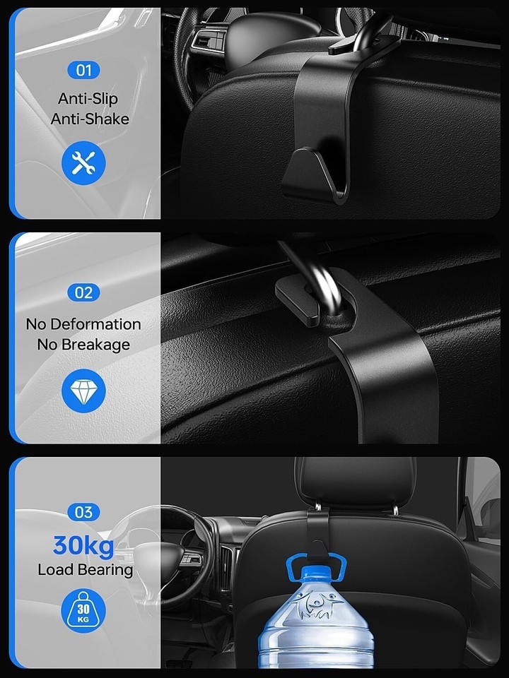 ?Organize Car Space?it converts your car?s headrest into a storage space, help you keep your car interior perfectly clean and organized, the headrest hook can hang groceries, handbags, purses, schoolbags, umbrellas, water bottles, shopping bags, baby supplies and much more.