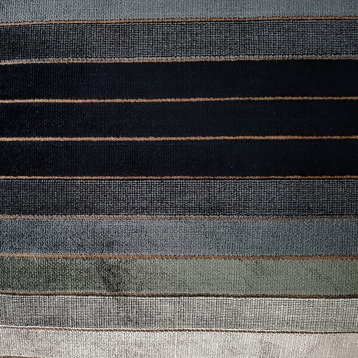 The Carbon Stripes Velvet Pillow features one inch wide stripes that change from black to gray, olive green and taupe as you move toward the center of the pillow. The back to the pillow is a solid color black velvet.