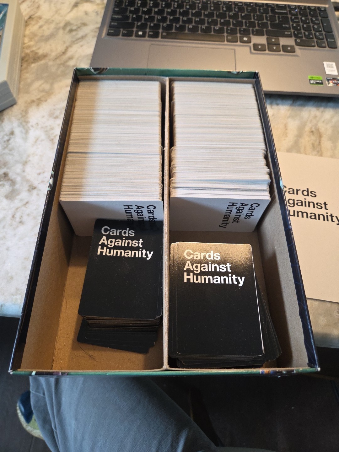this is a large quantity of Cards Against Humanity Cards, there are numerous sets mixed in together but I'm not sure which ones, probably 700 cards, they do not come in their original box