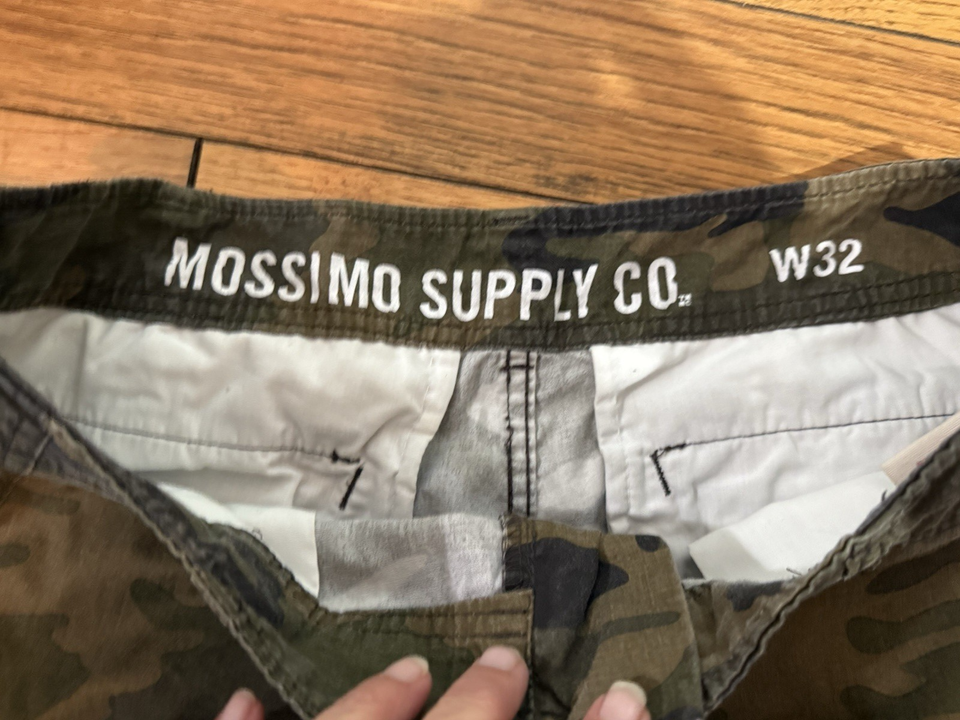 The Mossimo Supply Co. Cargo Shorts in a camo camouflage pattern are a stylish and practical addition to any man's wardrobe. Made from durable cotton fabric with a dark wash, these shorts feature a button closure and flat front design. The cargo style includes multiple pockets for added functionality, making them perfect for summer, fall, and spring seasons. The multicolor green camo design adds a trendy touch to these versatile shorts, suitable for everyday wear.