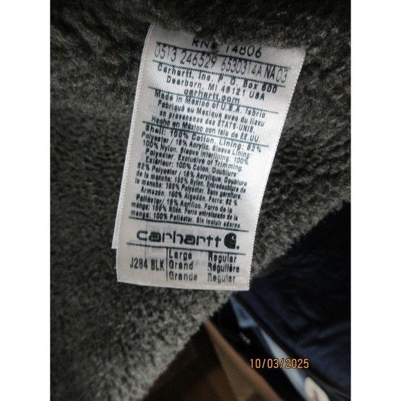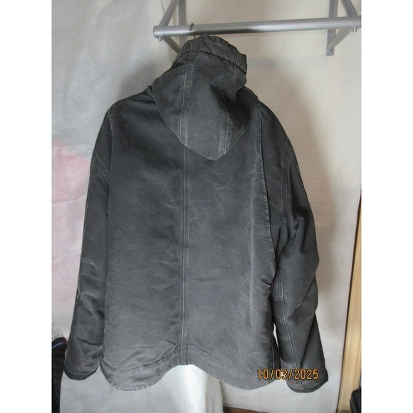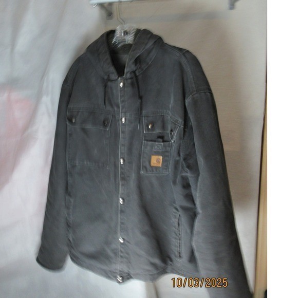 Keywords: Carhartt, hooded jacket, duck canvas, sherpa lined, work jacket, mens outerwear, gray jacket, active jacket, casual jacket, button front jacket, fall jacket, winter jacket, utility jacket Sleeve Length is from armpit is 22" Length 26"
