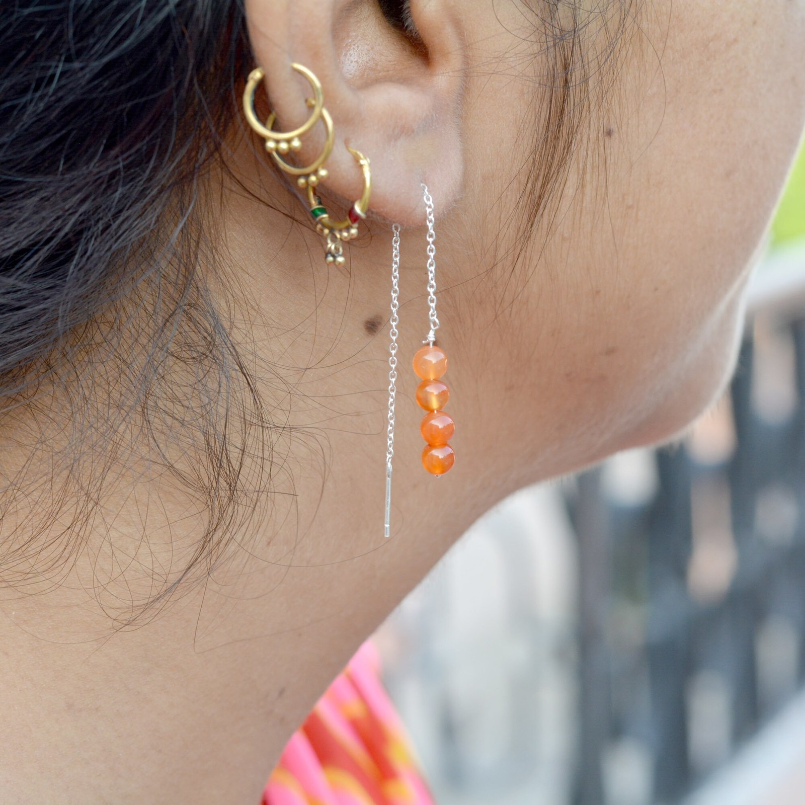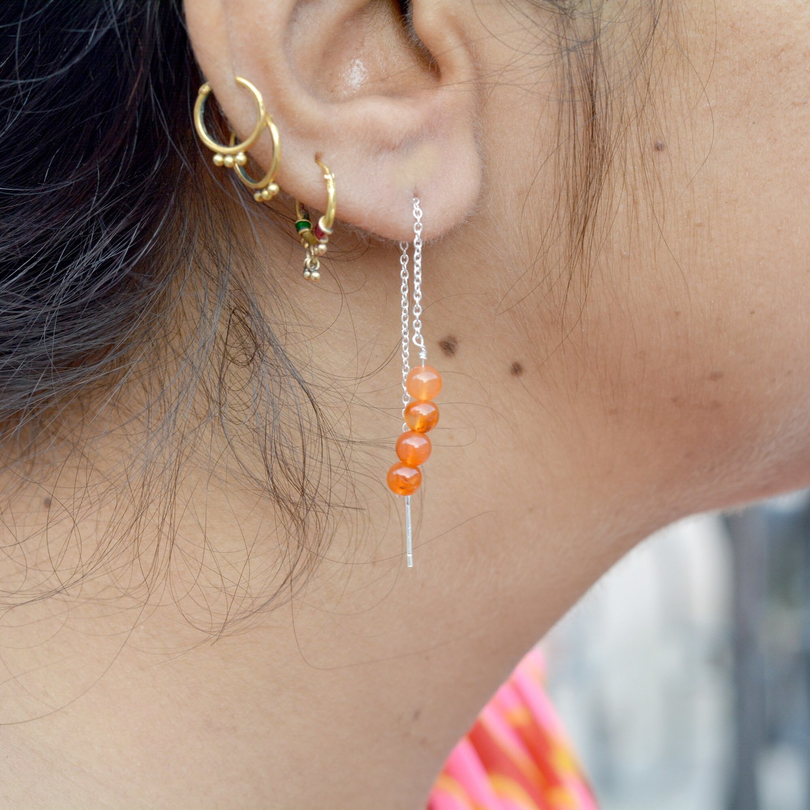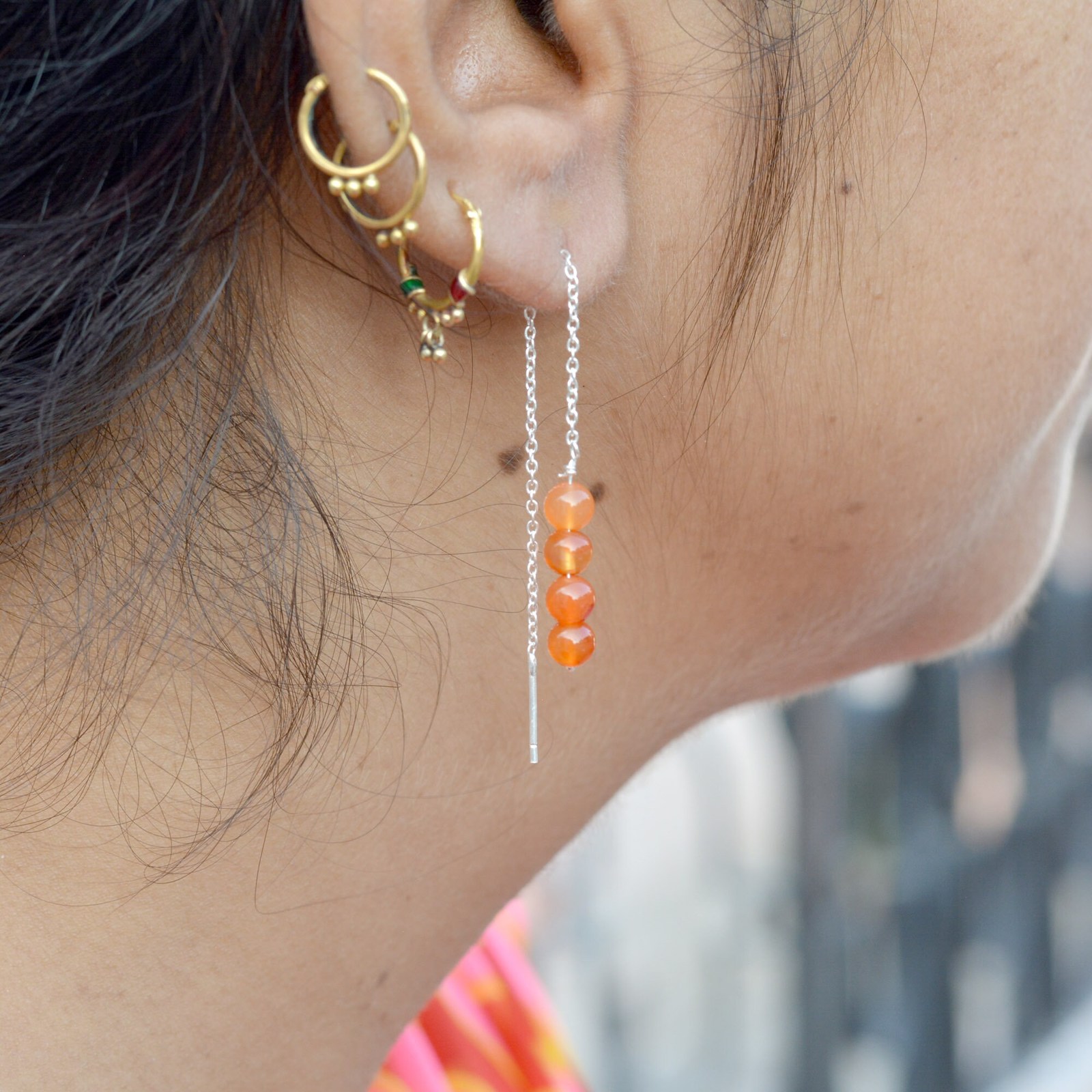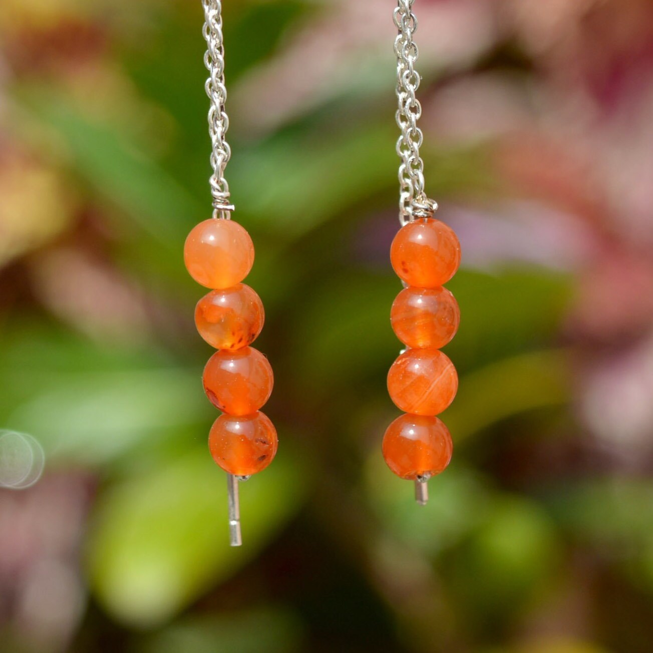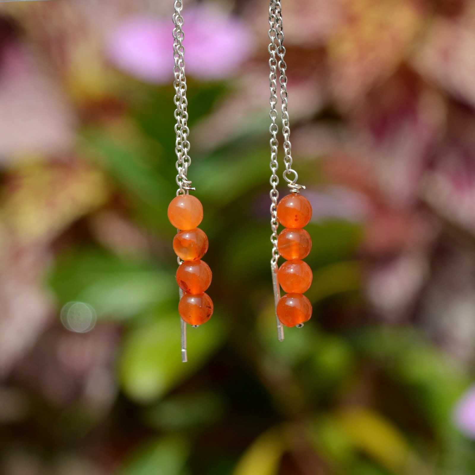 - Carnelian Beads Dangle Drop Earrings Minimalist Silver Chain Threader Earrings