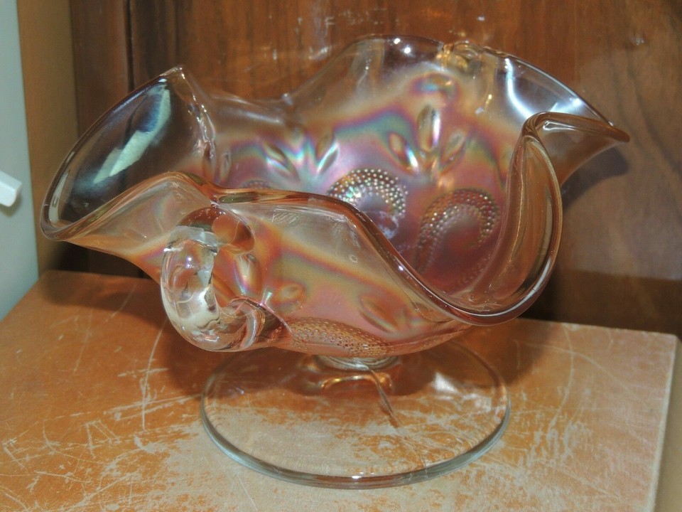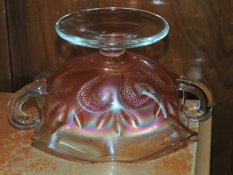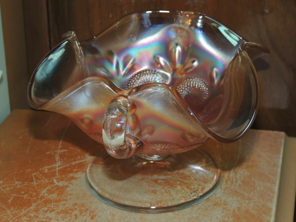 Carnival Glass Compote 6.5" Question Marks Bon Bon Marigold Amber Iridescent