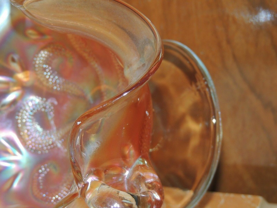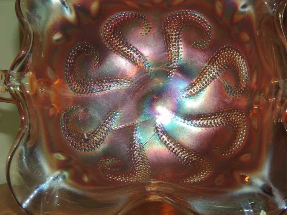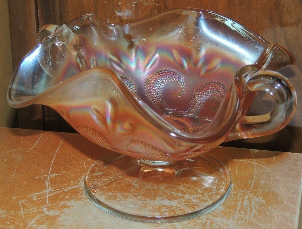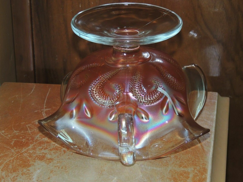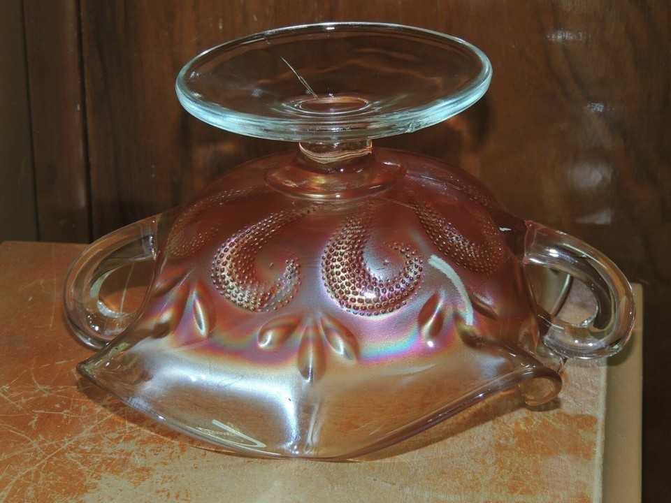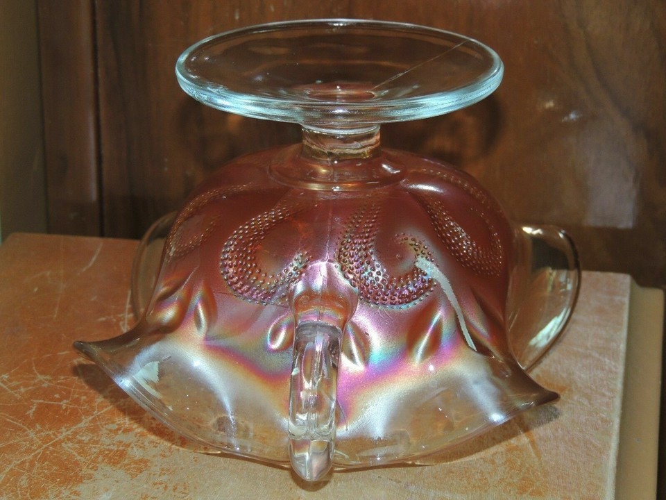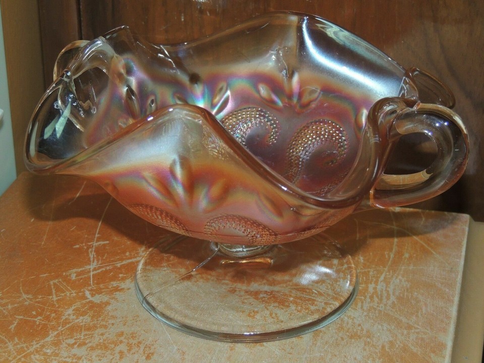 CARNIVAL GLASS BOWL, POSSIBLY DUGAN GLASS COMPANY. PLEASE LOOK AT THE PICTURES CAREFULLY. APPROXIMATE SIZE IS 6.5+ INCHES (INCLUDING THE HANDLES) BY 5.25 INCHES AND 3.5 INCHES HIGH. SHIPPING IS BASED ON THE APPROXIMATE PACKAGED WEIGHT. I DO SHIP INTERNATIONALLY. USPS SHIPPING IS ONLY AVAILABLE WHERE TRACKING IS OFFERED, ALL OTHERS MUST BE SHIPPED FEDEX OR UPS. ALL TAXES, TARIFFS AND DUTIES ARE THE RESPONSIBILITY OF THE BUYER. RETURN POLICY: IF THE ITEM YOU RECEIVE IS IN SOME WAY MATERIALLY DIFFERENT FROM WHAT IS REPRESENTED HERE, I WILL GLADLY REFUND YOUR MONEY. MONEY WILL NOT BE REFUNDED BECAUSE OF MINOR FLAWS OR MISUNDERSTANDINGS. YOU MUST CONTACT ME PRIOR TO RETURNING ANY ITEM. IF THE ITEM IS NOT AS DESCRIBED, I WILL REFUND THE FULL PRICE, PLUS SHIPPING AND RETURN SHIPPING. This listing created with GLETech Multiple Selling Channel tools.