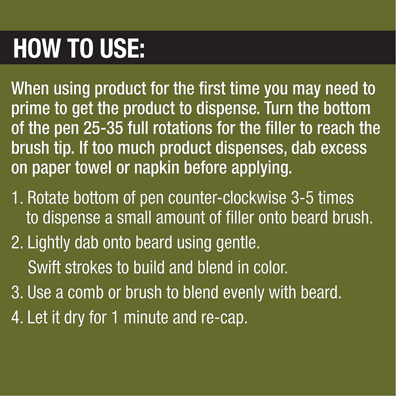 Quick and easy to apply, dries quickly and washes off easily- when using beard product for the 1st time you may need to turn the pen 25-35 rotations for filler to reach brush