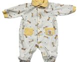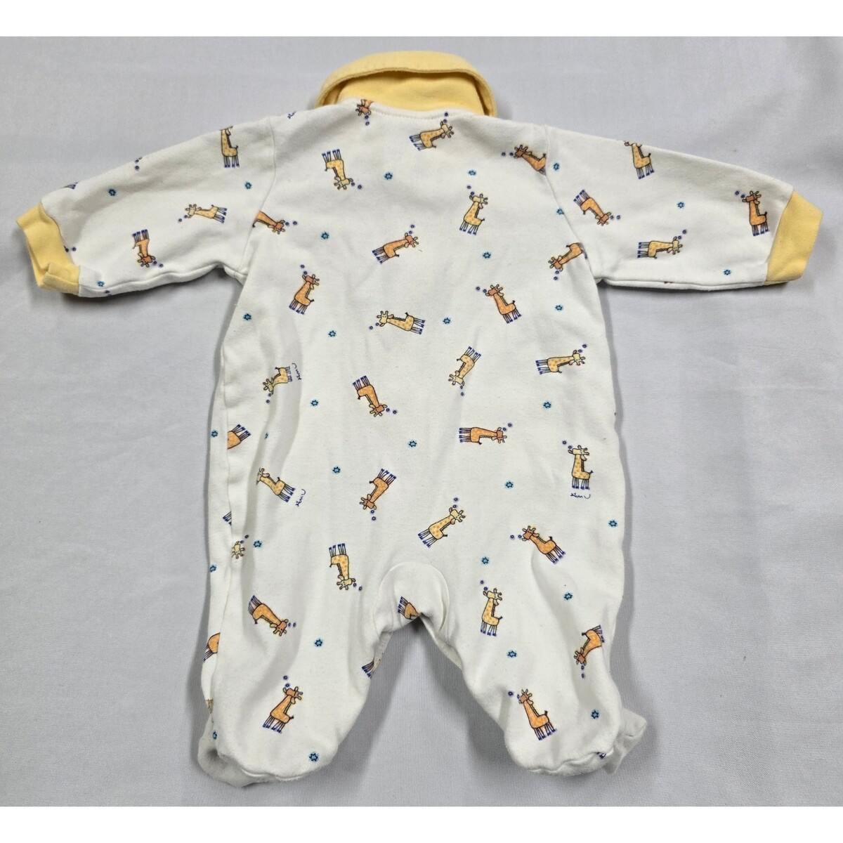 Keywords: baby boy, baby girl, sleepsuit, one piece, organic, gender neutral, animal print, giraffe, yellow trim, snap front, cotton blend, newborn, infant, cozy, playwear