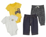 This sale is for one (1) Carter's Baby ~ Four (4) Piece Pants Body Suit Sets Size 9 Months Colors include ~ yellow ~ light gray ~ dark gray ~ blue Set includes; 2 bodysuits ~ 1 jogger pant 1 knit denim pant Light gray bodysuit includes faux 3 button closure at collar ~ tractor graphic at chest area and 3 snap closure @ bottom Yellow bodysuit includes yellow white stripes ~ tractor graphic at chest and 3 snap closure @ bottom Dark gray jogger pants have an all over tractor design ~ elastic waistband faux drawstring Blue knit denim pants have elastic waistband and faux front pockets Bodysuits are 100% cotton Jogger pants are 100% cotton Knit denim pants are 97% cotton ~ 3% elastane These items are brand new with tags Please view photos for a good description of this item Thank you!