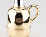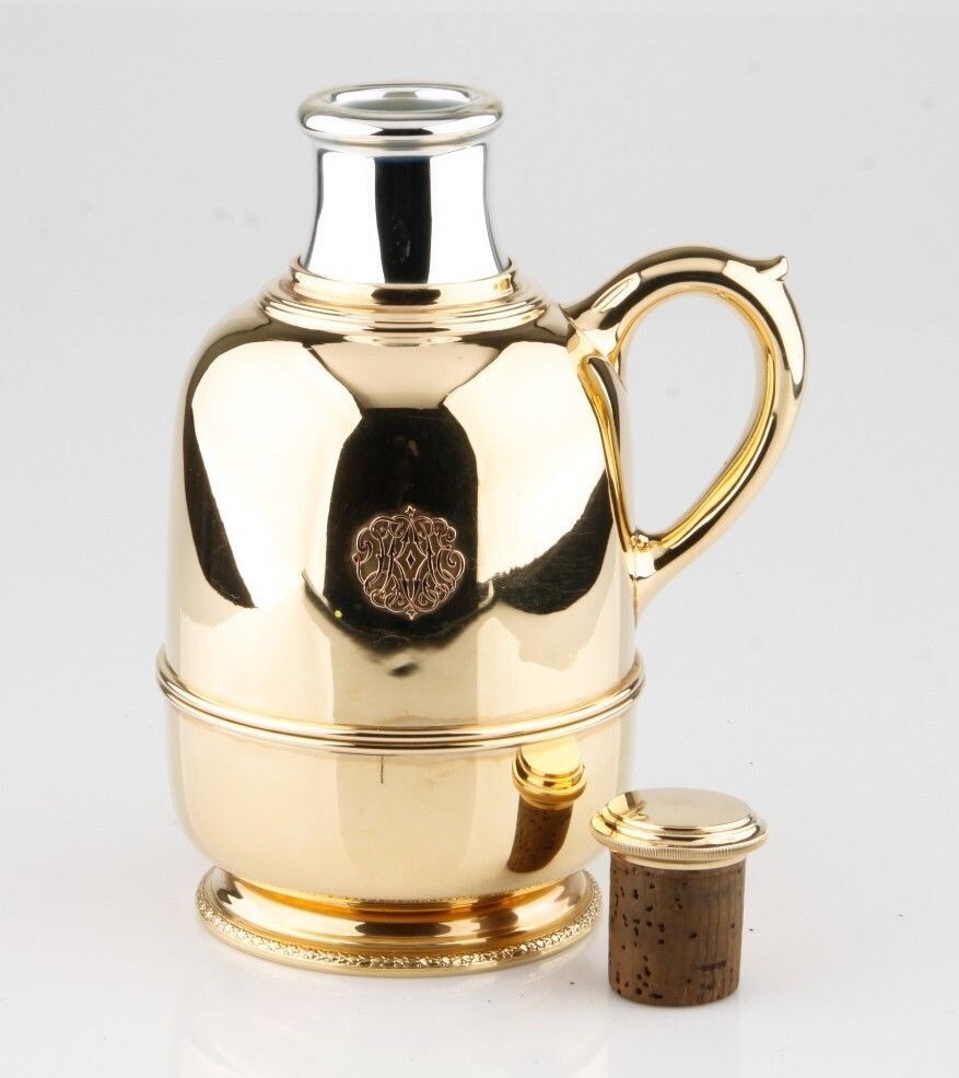 The thermos bottle of Cartier is mainly in 14 carat gold and is provided with a handle. The bulbous body stands on a round, recessed foot, decorated with an ornamental trim. On the white golden neck sits a yellow golden lid that closes the flask with its attached cork. The thermal glass keeps the temperature of any beverage while it is contributing to the weight of the vessel. Especially nice is the filigree, ornate emblem on the center of the body. These vessels were mostly produced in the United States and served as gifts for customers. Mainly these cans were made in silver, so the golden one is very rare as well as the hallmark 'Cartier.' Usually these 'giveaways' were provided only with the purity mark, so here we have a rarely beautiful and precious exception of Cartier's thermos bottles.