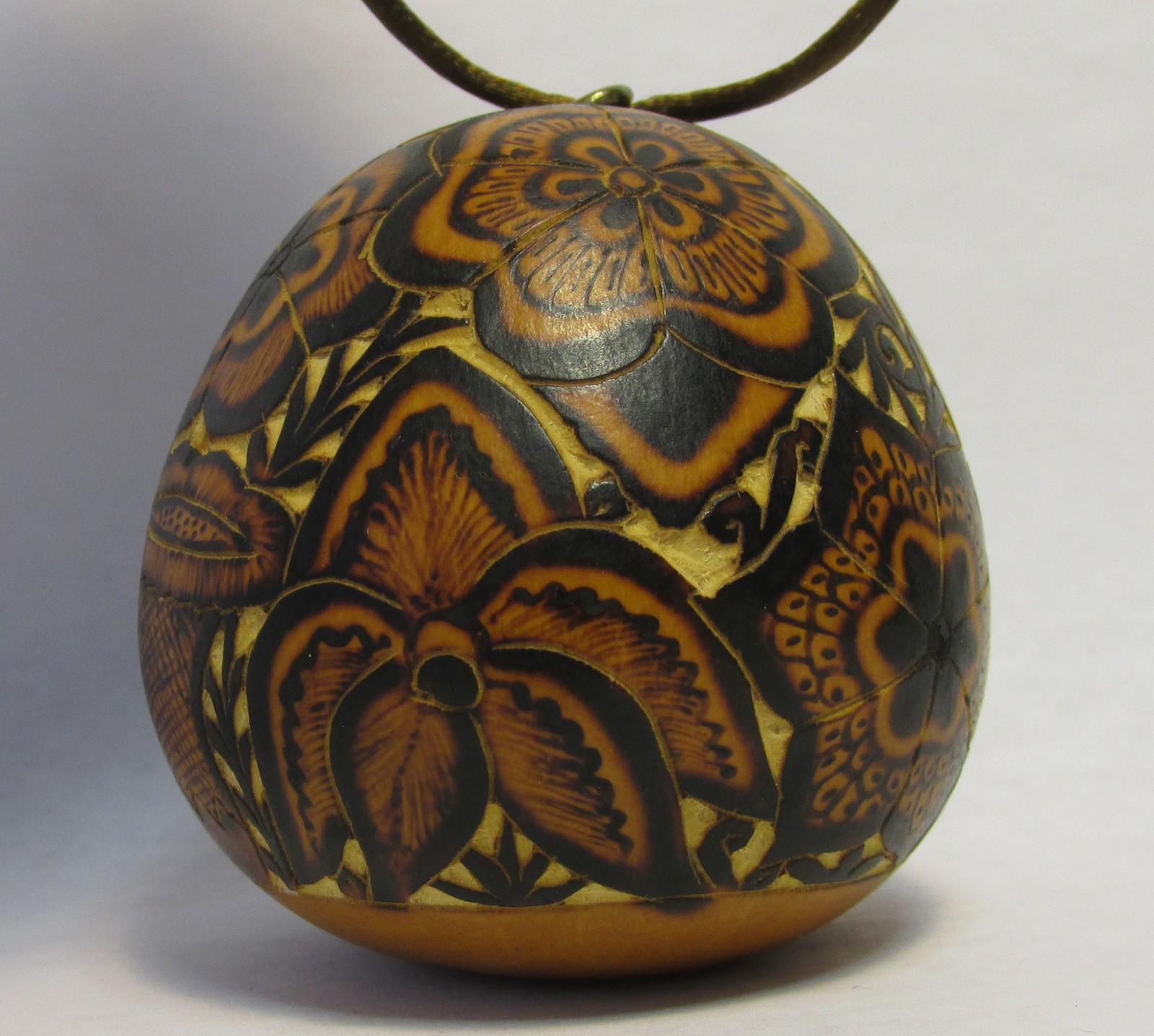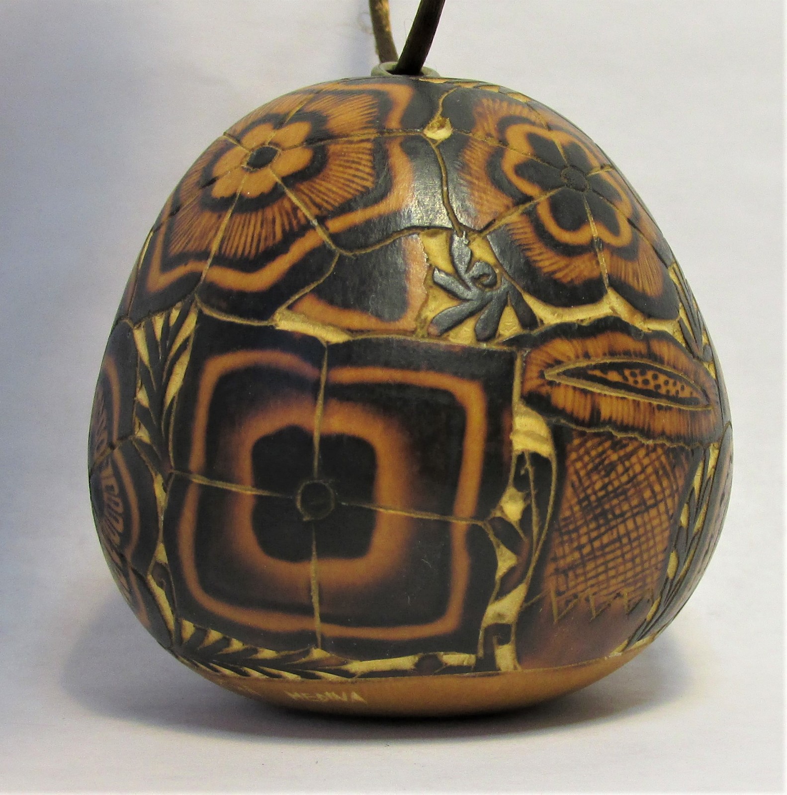 Carved floral gourd, (dried squash) signed Bertha Medina from the Andes of Peru